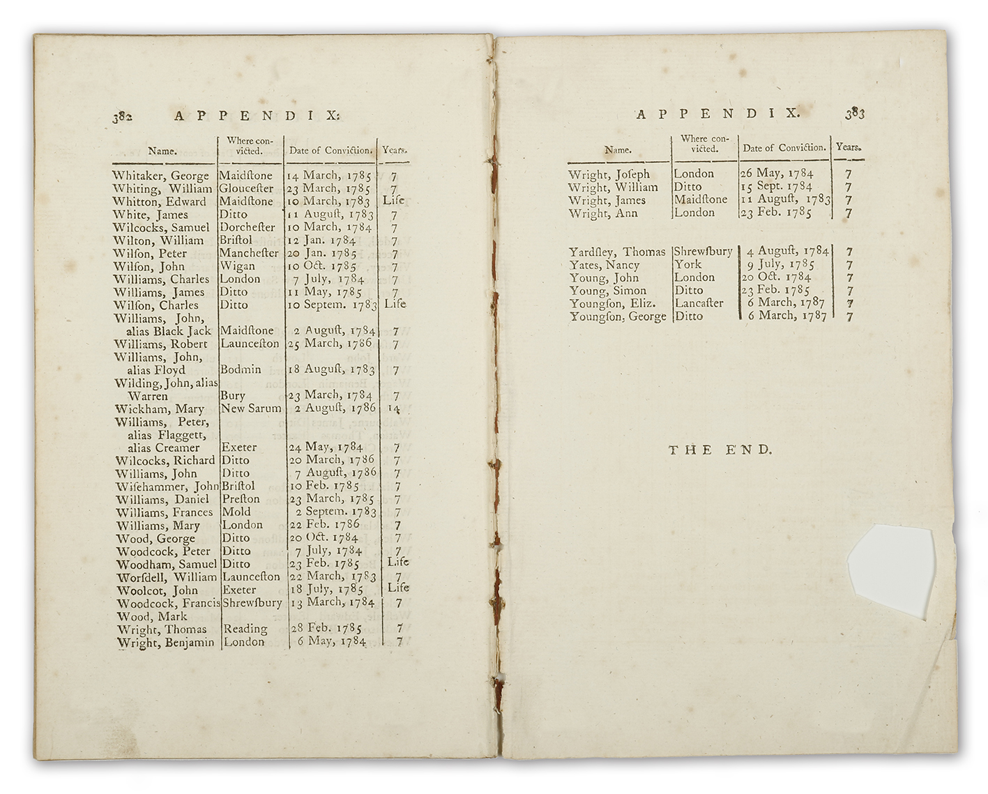 Rare printed C18th list of all the convicts transported to Botany Bay in 1787, not only the earliest record of the convicts on board the First Fleet but the only printed record. It lists in alphabetical order the convicts names, where they were convicted, their crimes and length of their sentences; most were sentenced to seven years but some received fourteen years. The list is on 25pages.
