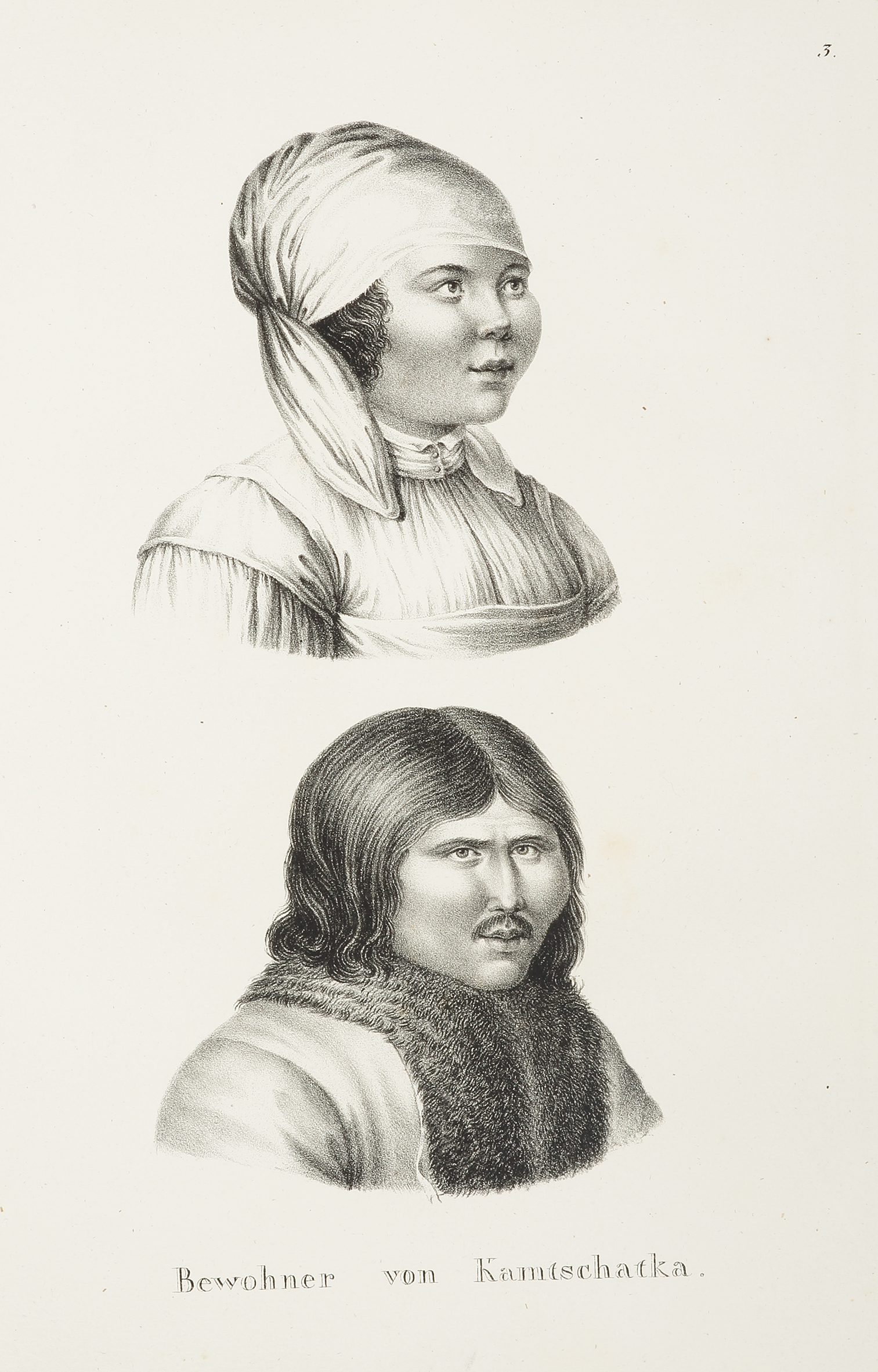 Lithograph of a man and woman of Kamchatka. A three-quarter portrait of a woman of Avacha Bay, Kamchatka, wearing a head scarf with side-flaps over either shoulder. A three-quarter portrait of a man of Avacha Bay, Kamchatka, with long hair … Read Full Description