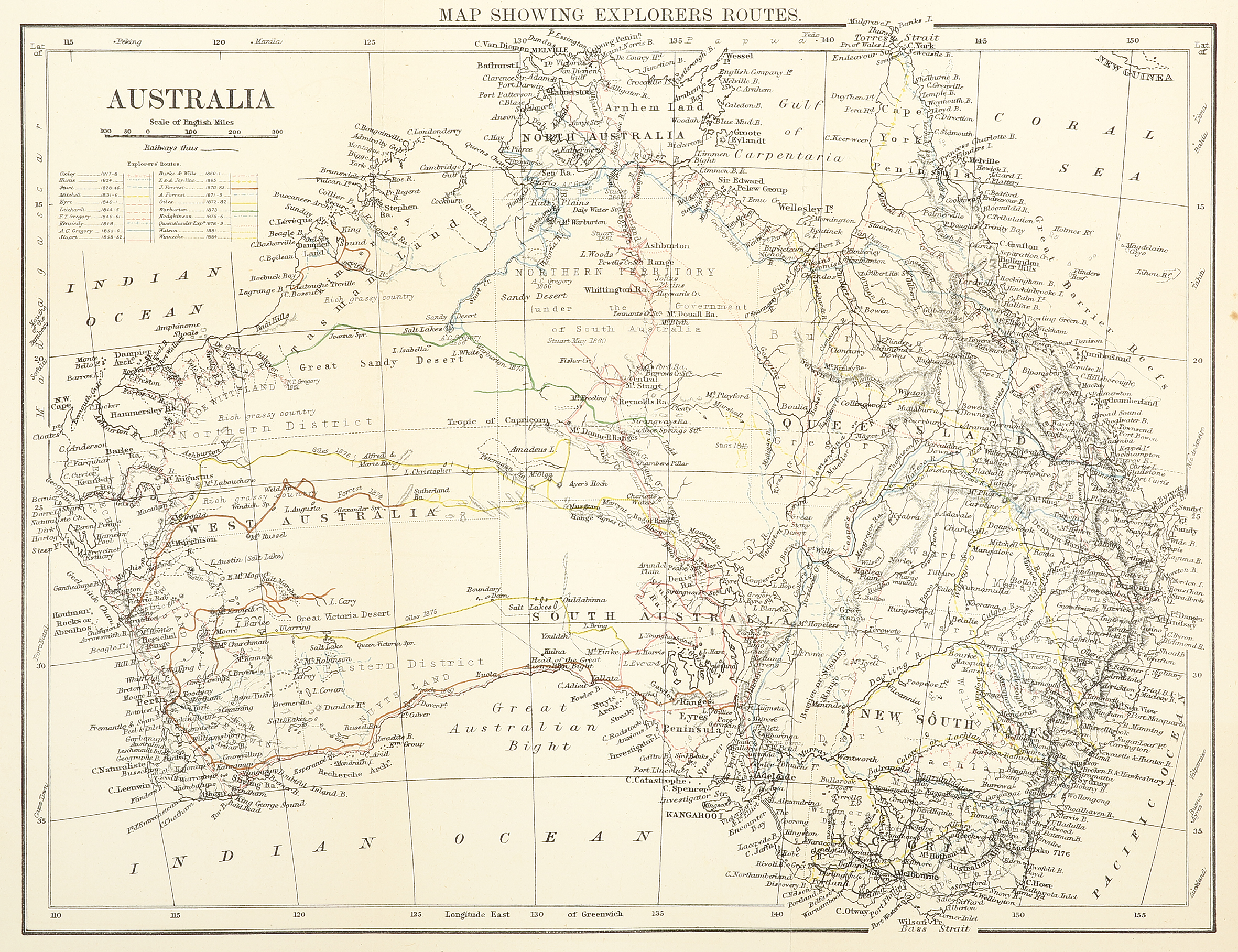 Very detailed map of the continent showing excellent inland information, with all the major inland explorers and their routes up to 1880 marked.