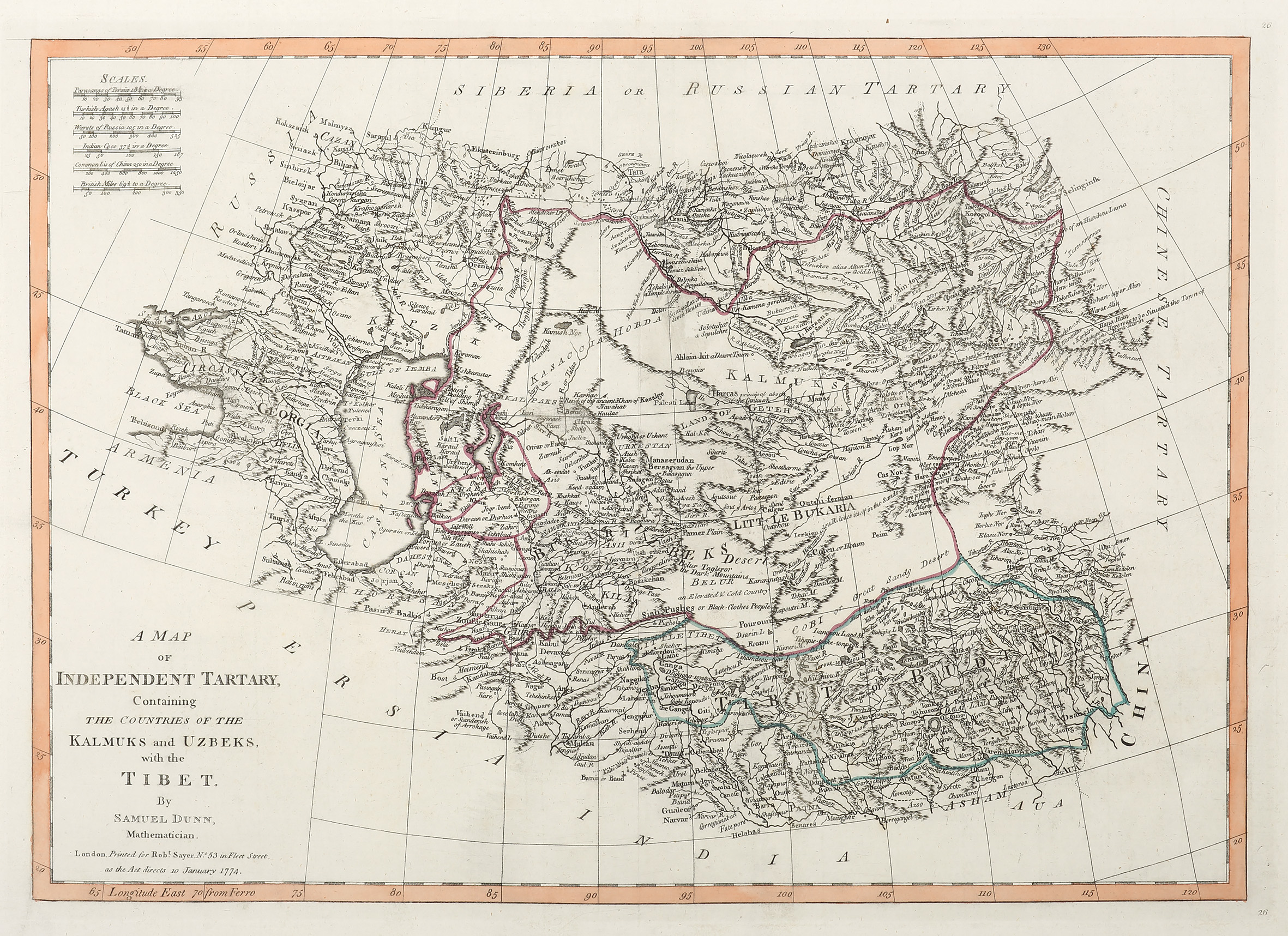 Rare c.18th map of central Asia with good detail of Tibet by Samuel Dunn (1732-1794).