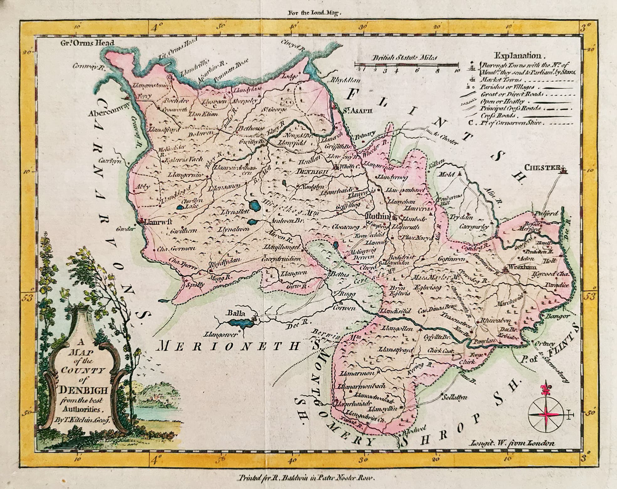 Small decorative c.18th map of Denbigh, Wales by Thomas Kitchen.