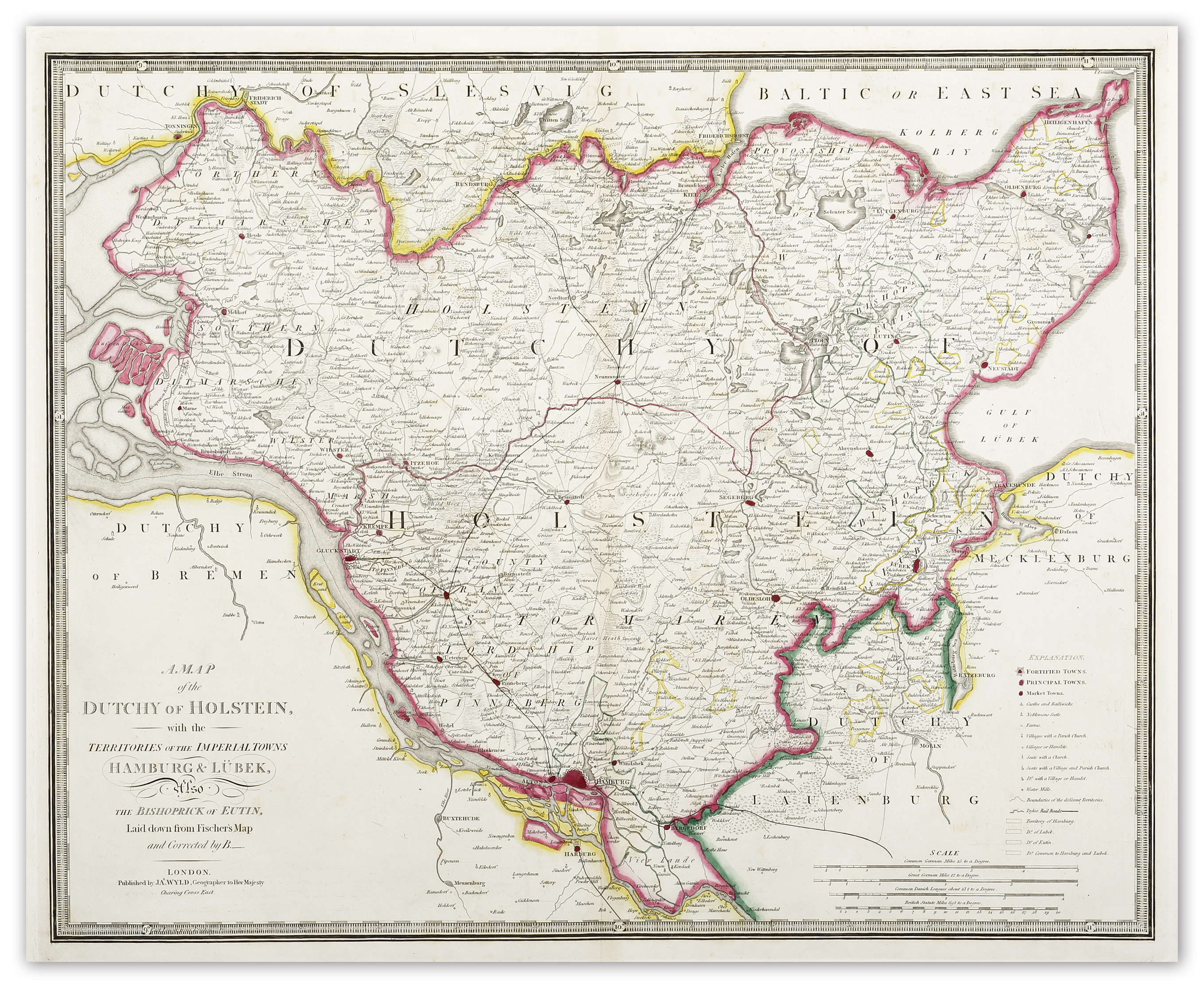 Very large scale map of the Dutchy of Holstein, detailed with key noting, fortified towns, principal towns, market towns, castles etc