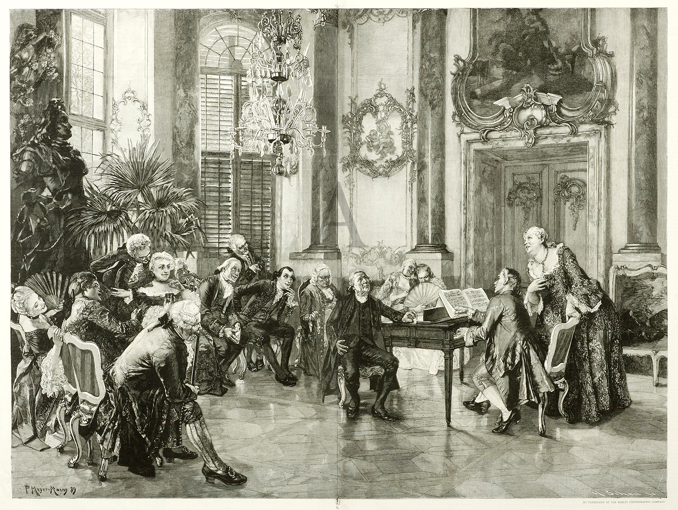 Engraved view of a piano recital in an opulent drawing room.