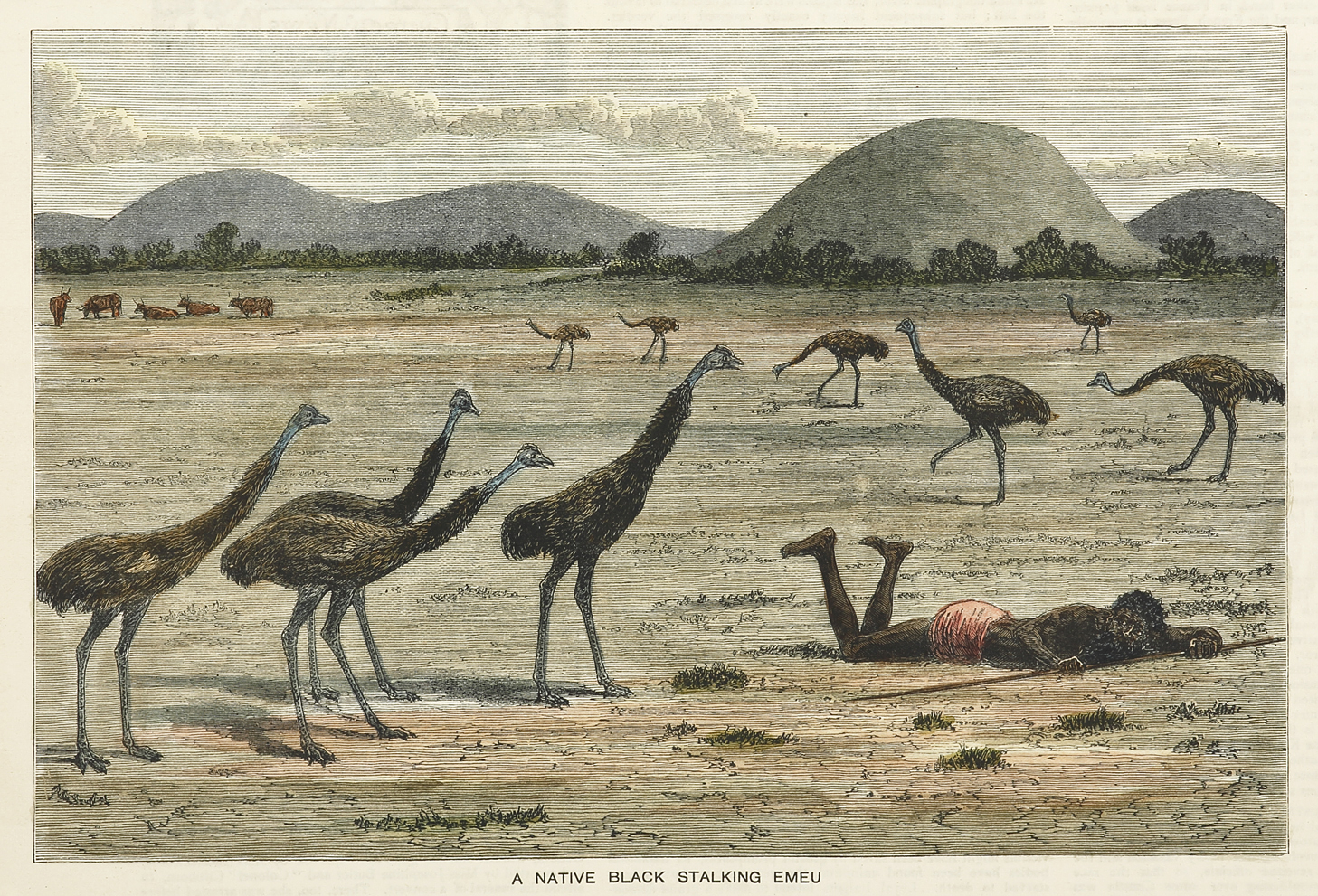 Colonial engraving of an aborigine laying motionless on the ground while stalking emus.