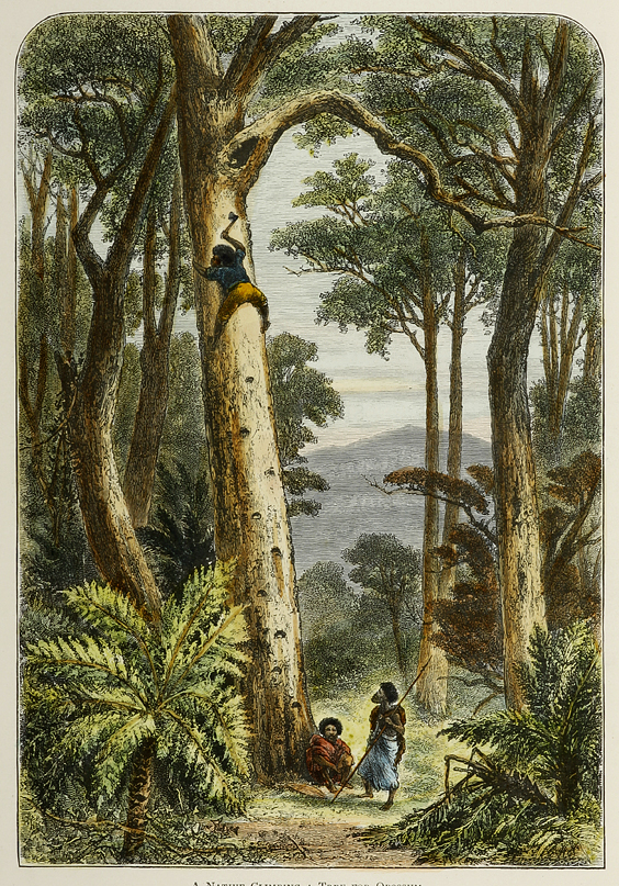 Scarce c.19th engraving depicting an aboriginal climbing a tall eucalyptus in the Australian bush.