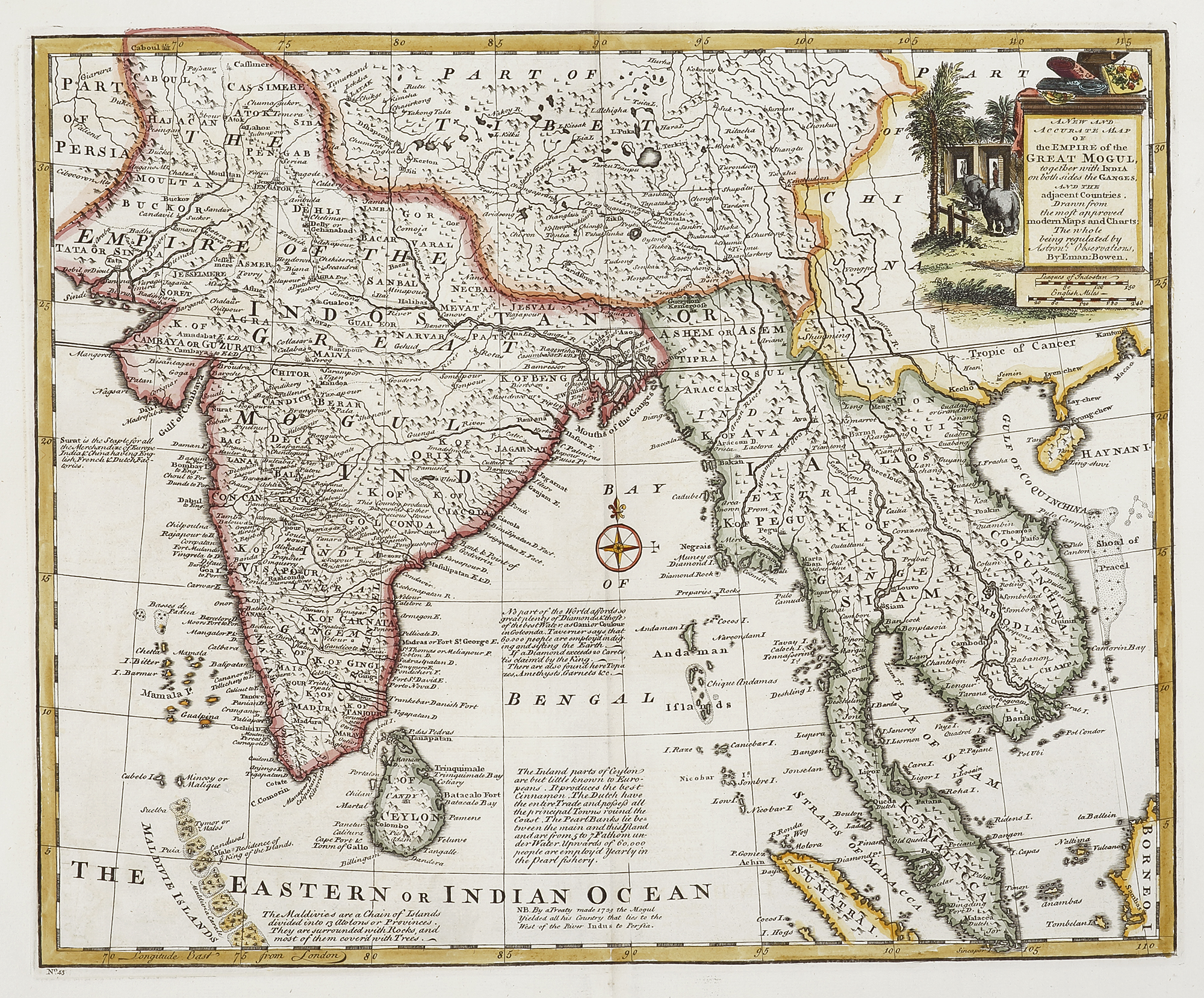 Superb c.18th map of the Moghul Empire by Emmanuel Bowen with a beautifully engraved embellished title cartouche at top right.