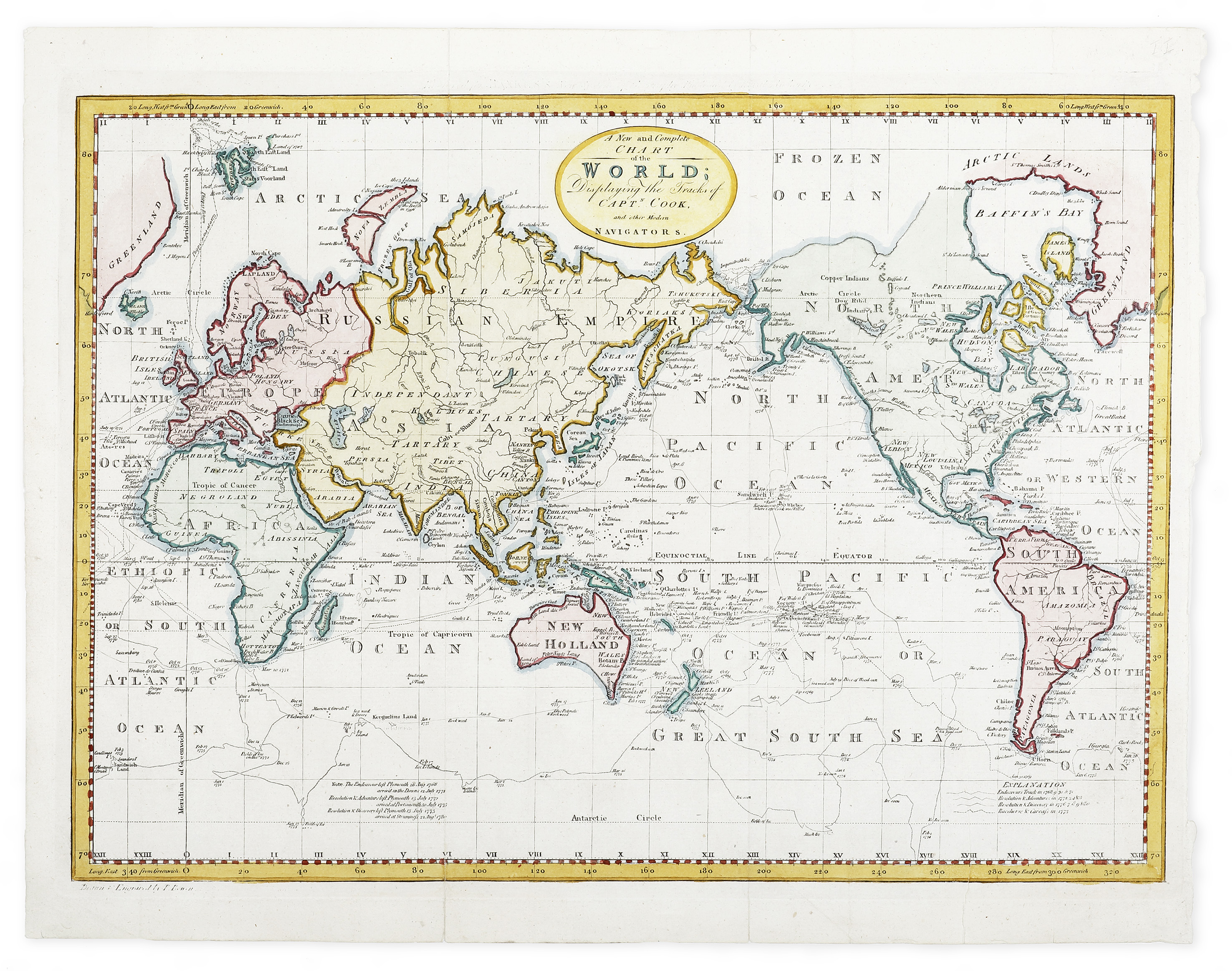 Scarce engraved world map on Mercators Projection based on Robert’s map issued in the British Admiralty accounts of Cook’s third and final voyage.