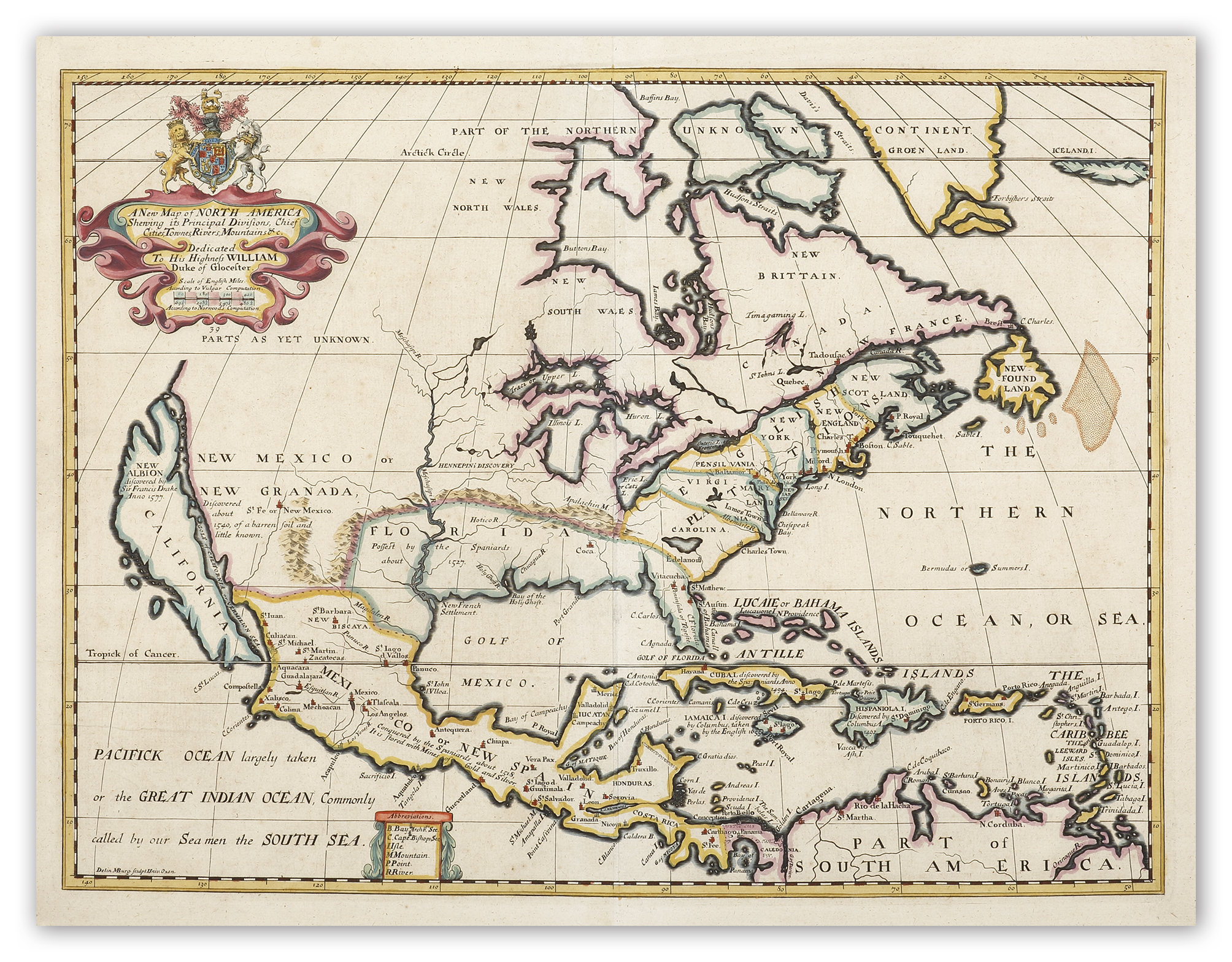 Attractive and scarce map fully hand coloured example of Edward Wells map of north America. An elaborate title at top left contains a dedication to His Highness William the Duke of Gloucester, the Royal Crest and a scale of Miles. The … Read Full Description
