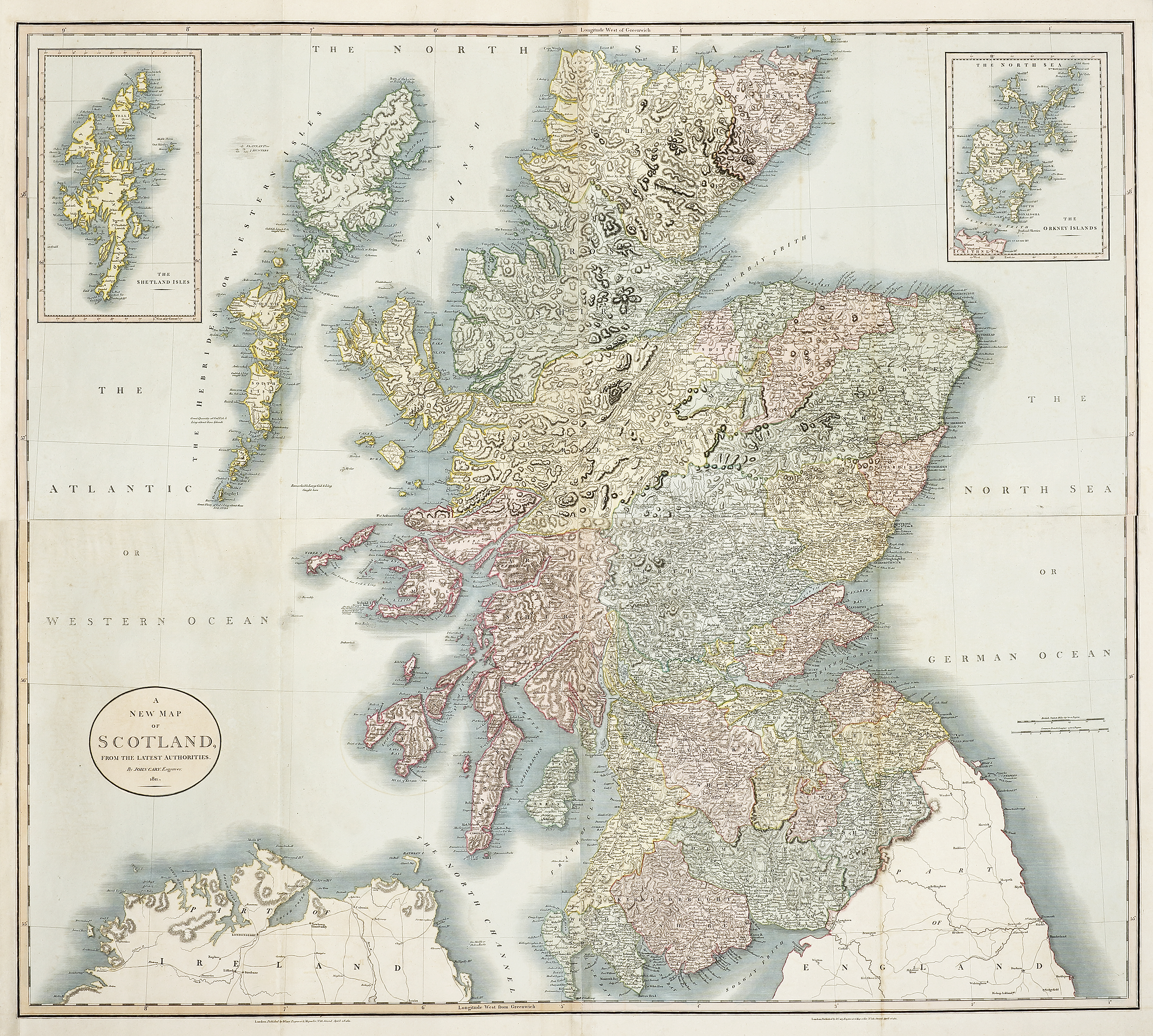 Impressive wall sized chart of Scotland on four joined sheets by John Cary (1755-1835) dated 28th April 1811. There is an inset at top left of the Shetlands and another at top right of the Orkney Islands.
