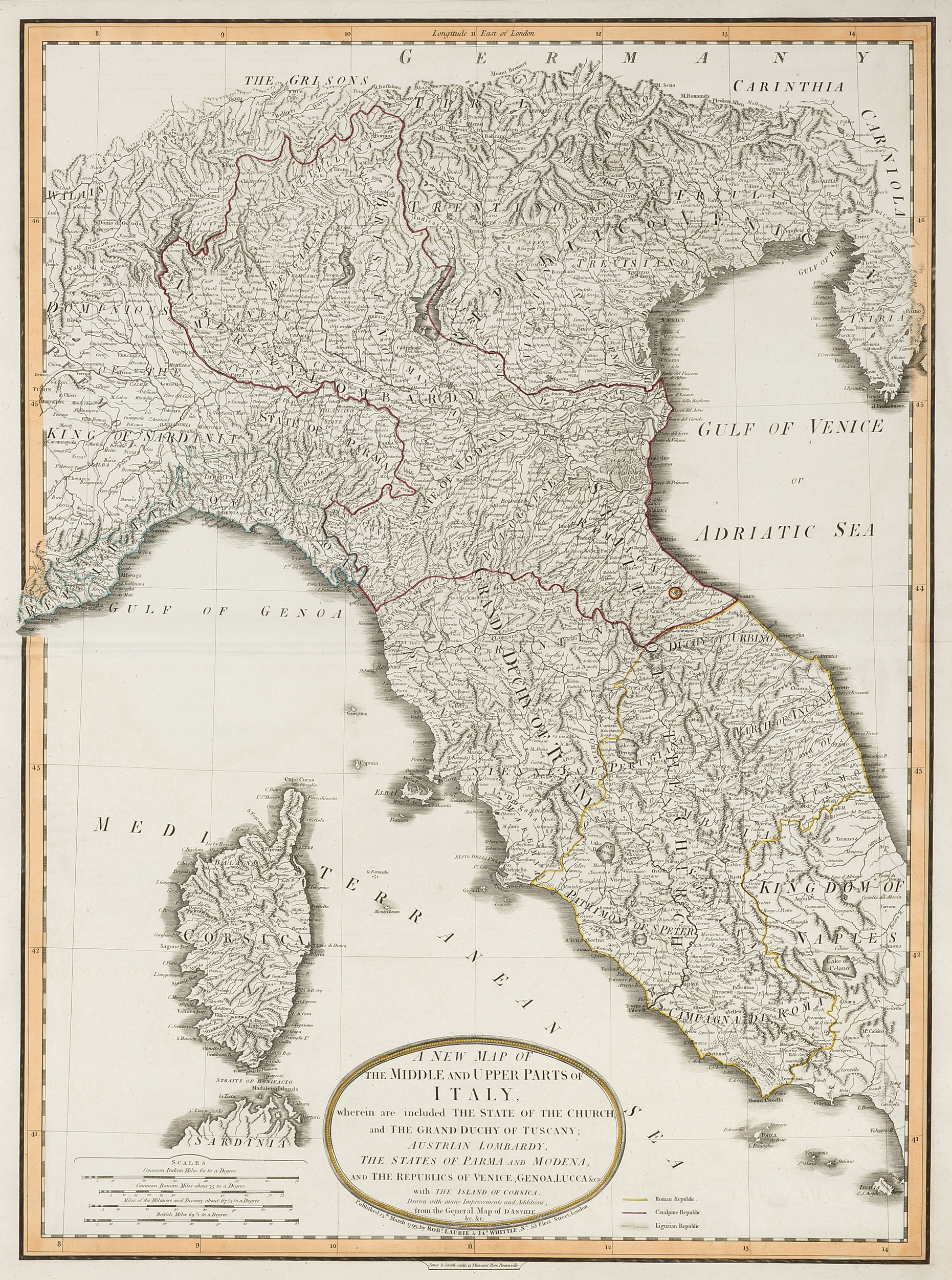 Large and detailed map of Italy and Corsica to Western Austria. From Laurie and Whittle, A new universal atlas, exhibiting all the empires, kingdoms, states, republics, &c. &c. in the whole World….