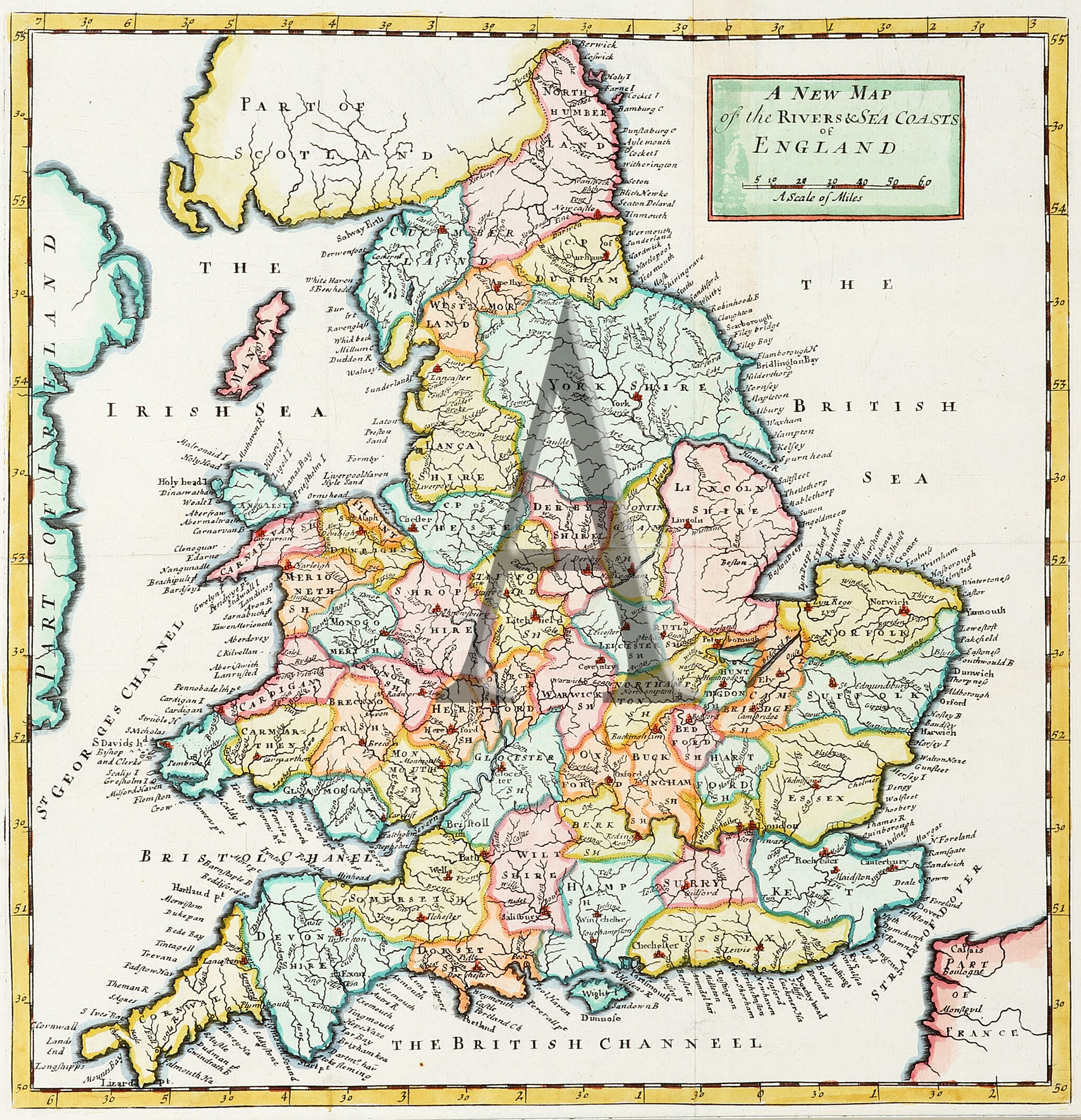 Between about 1675 and his death in 1703, he was based under the sign of the Atlas at premises in Cornhill and New Cheapside, London. His cartographical output was large and varied. His best-known maps are those of South Wales, North Wales and the English Counties first published in a new edition of Camden’s “Britannia” in 1695, and subsequently reissued in 1722, 1753 and 1772. These maps were based on new information from gentlemen of each county, and were newly engraved. Each had a decorated cartouche, and showed numerous place names.
