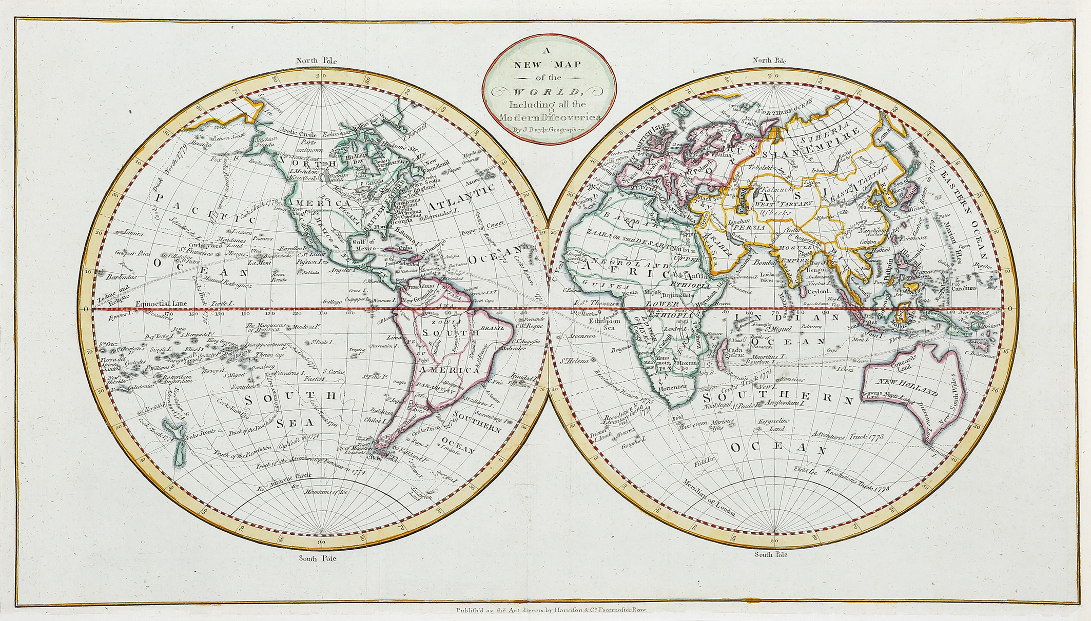 Scarce c.18th double hemisphere world map which includes the tracks of Captain Cook’s three voyages of exploration.