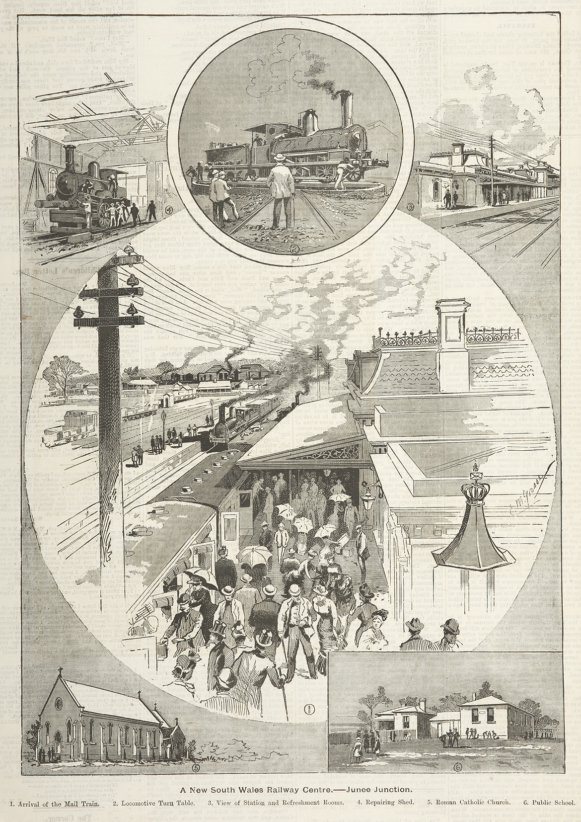 Very rare engraving of the Junee Railway station. The original station building burned down in January 1882 and the new one was built at a cost of £3,434 was opened by Joseph Palmer Abbott on 5 March 1885. The station building was constructed under the direction of John Whitton, Chief Engineer of the New South Wales Government Railways.