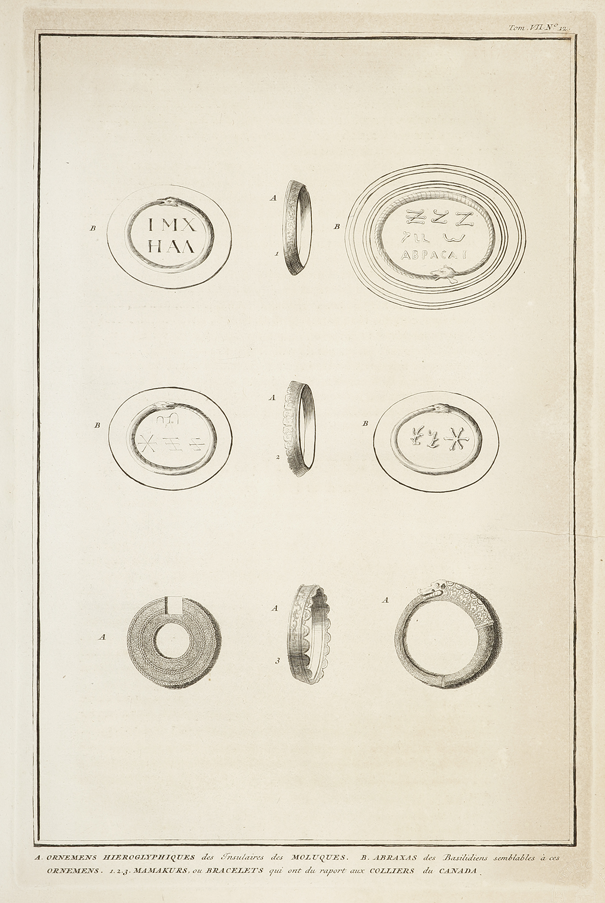 A. Ornements Hieroglyphiques des Insulaires des Moluques. B. Abraxas des Basilidiens semblables a ces Ornemens. 1.2.3. Mamakurs, ou Bracelets qui ont du raport aux Colliers du Canada.