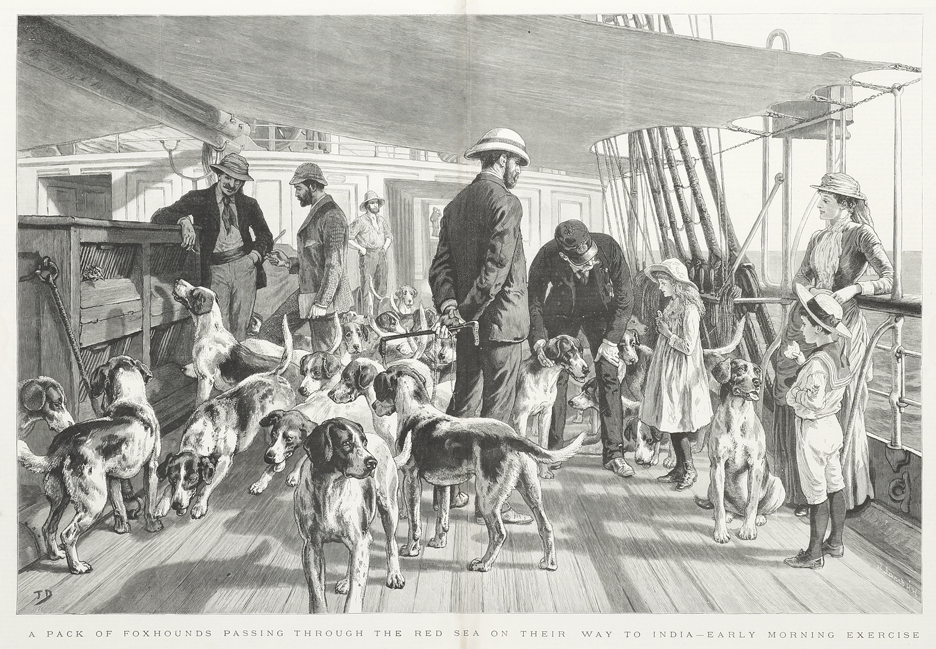 Superb engraving of foxhounds on their way to India. From the original edition of The Graphic.