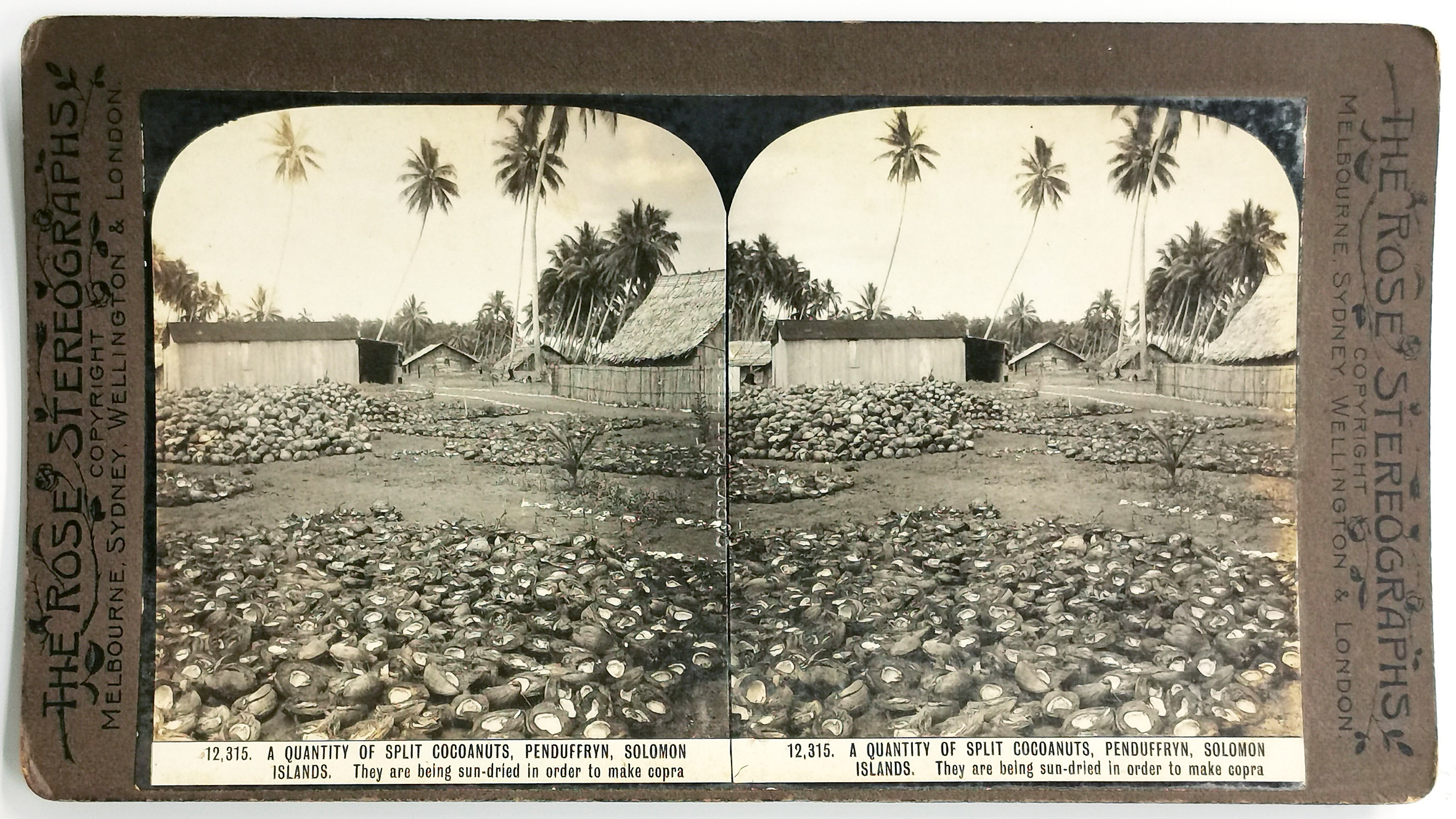Published by George Rose, Melbourne, Sydney, Wellington & London. “A quantity of split cocoanuts, Penduffryn, Solomon Islands. They are being sun-dried in order to make copra.”