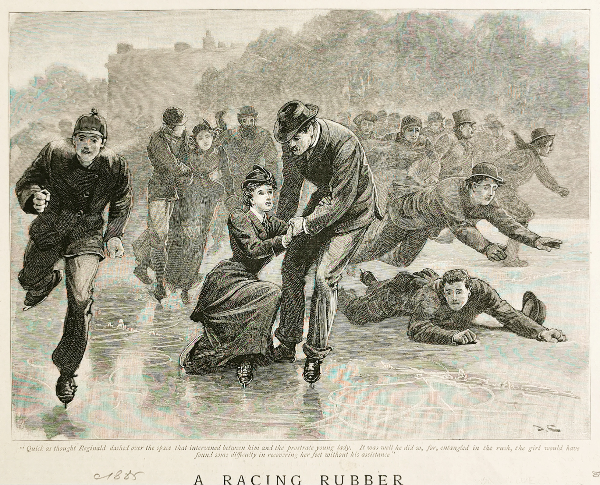 Frenetic scene of skaters racing. From the original edition of The Graphic.