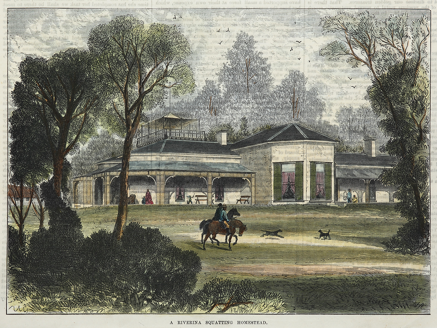 Scarce c.9th hand coloured engraving of a colonial Riverina squatters homestead.