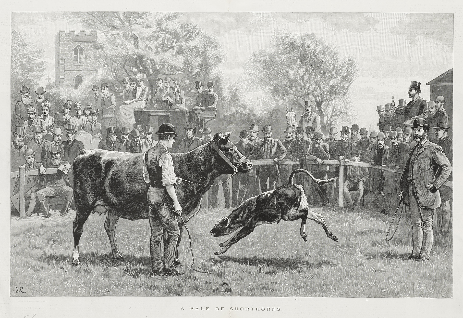 Engraving of short horn cattle. From the original edition of The Graphic.