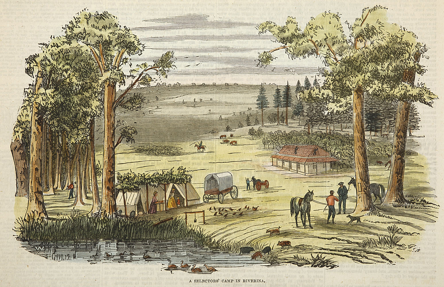 Rare c.19th hand coloured engraving showing selector’s living in tents in the Riverina while their homestead is being built. From the original edition of the Town and Country Journal.