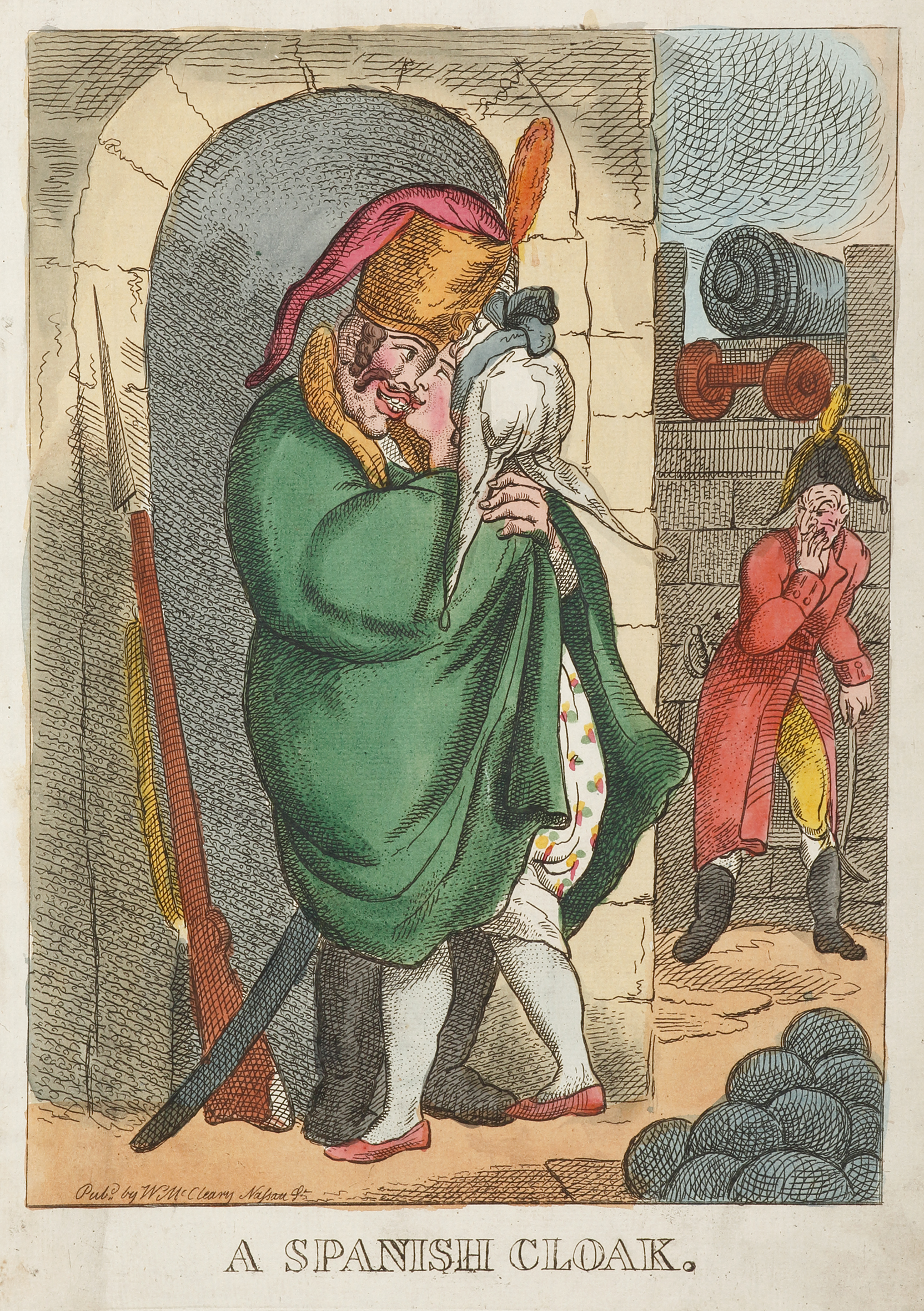 Rare Irish satirical print of a soldier while on sentry duty, is embracing a young woman. They are wrapped together in the soldier’s ample green cloak and stand together, face to face. In the background on the battlement of a fortification stands a superior officer who whilst noticing the pair together, sniggers mischievously. Pirated from Thomas Rowlandson’s original version published 1813 by Thomas Tegg, No. 111 Cheapside, London in 1812 but printed in reverse, with McCleary’s Nassau Street, Dublin address.