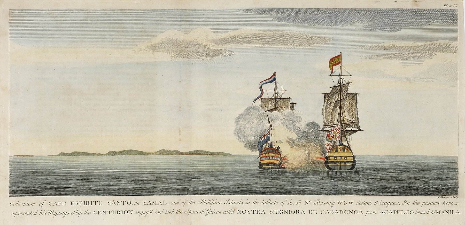 Scarce c.18th engraving of Lord Anson’s Centurion, in battle in the Philippines with the Spanish Galeon, Nostra Seigniora de Cabadonga, from the English edition of Lord Anson’s famous circumnavigation of the world.