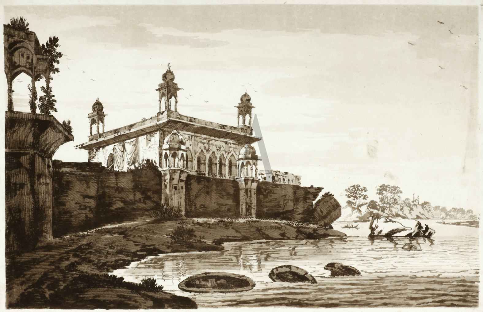 Rare c.18th aquatint by William Hodges (1744-1797) of Faizabad, India which had been the capital of Oudh under the Nawab, Shuja-ud-Daula who ruled between 1754-75. His son abandoned the palace when he decided to shift the capital from Faizabad back to Lucknow. It was later to be the centre of many battles of the Mutiny of 1857.