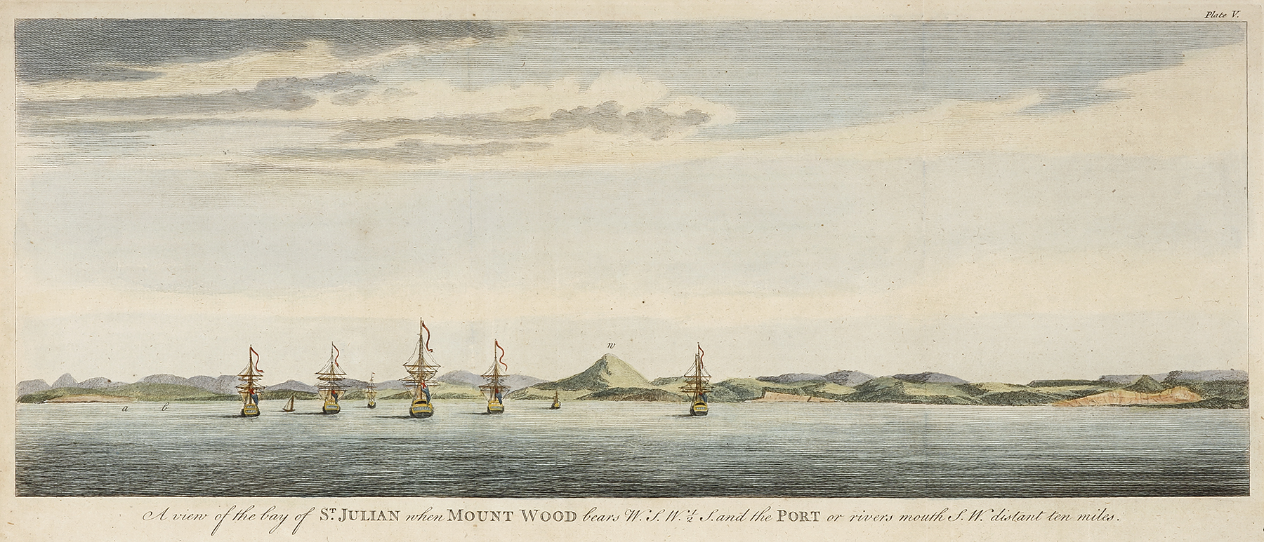 Scarce c.18th engraved view of View of the harbour of Port St. Julian or Puerto San Julián in present-day Patagonia, Argentina, from the English edition of Lord Anson’s famous circumnavigation of the world.