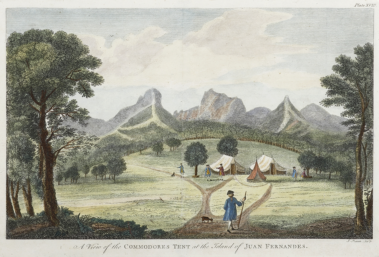 Scarce engraved view of Juan Fernandez Islands, Chile, show Lord Anson’s camp on the island, from the English edition of Lord Anson’s famous circumnavigation of the world.