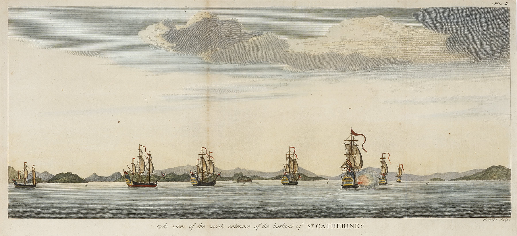 Scarce c.18th engraved view of the north entrance to Catarina Harbour, Brazil from the English edition of Lord Anson’s voyage.