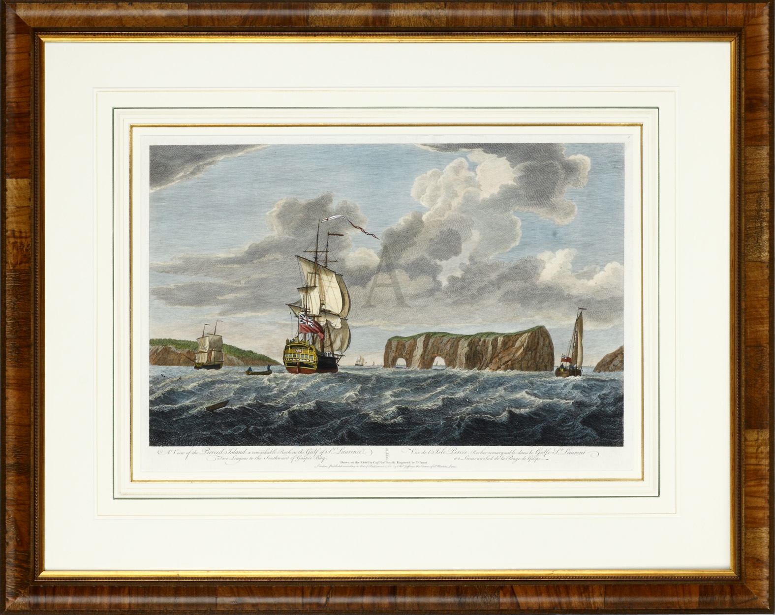 Rare view of Pierced or Perc� Rock in the Gulf of St Lawrence, one of the world’s largest natural maritime arches and a natural icon of Quebec. This is the first known view of the rock which includes two arches. The outer arch collapsed into the sea in 1845. As a result of its victory over France in the Seven Years’ War (1754-63), Britain acquired all North American land east of the Mississippi river, which included most of Canada and New France. The region north of the Thirteen Colonies was then named Quebec and remained largely French-speaking. Following the American Revolution, numerous British Loyalists fled north from the United States and settled in Canada, significantly changing the demographics of the region. The Constitutional Act of 1791 separated Quebec into two provinces along the Ottawa River predominantly English-speaking Upper Canada in the west and the French-speaking Lower Canada in the east. They remained separate provinces until the Union Act of 1841, which created the United Province of Canada. The Act was a direct result of large-scale rebellions (1837-8) which had swept across the provinces in response to the British colonial authorities’ rejection of the desire by settlers for responsible government. A small number of the rebels were later arrested and transported to Van Diemen’s Land and New South Wales. The landscape, engraved by Captain Henry Smyth, was included in a collection of views published by John Bowles, which are known collectively as Scenographia Americana (1768).