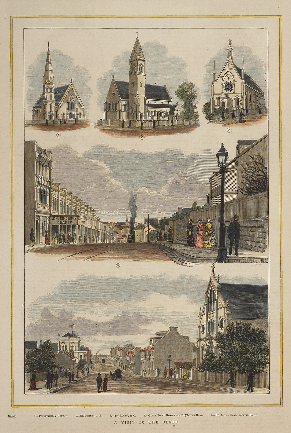 Rare engraving of Glebe with numerous insets. 1. Presbyterian Church. 2. St. John’s, C.E. 3. St. James’, R C. 4. Glebe Point Road from St. John’s Road. 5. St. John’s Road, Looking South. Rare engraving from the original edition of … Read Full Description