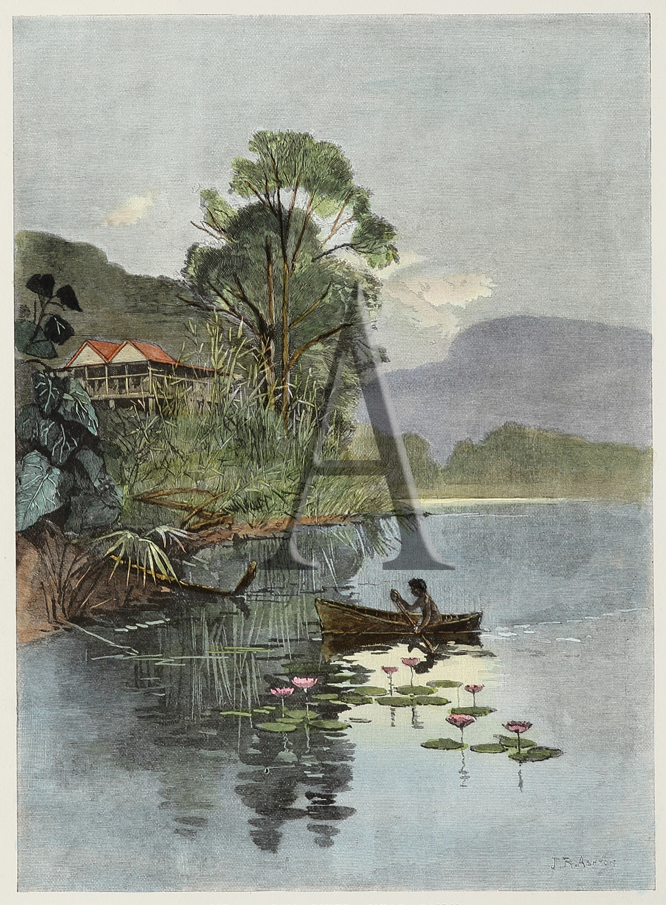 Colonial engraving of a view along the Barron River, Queensland.