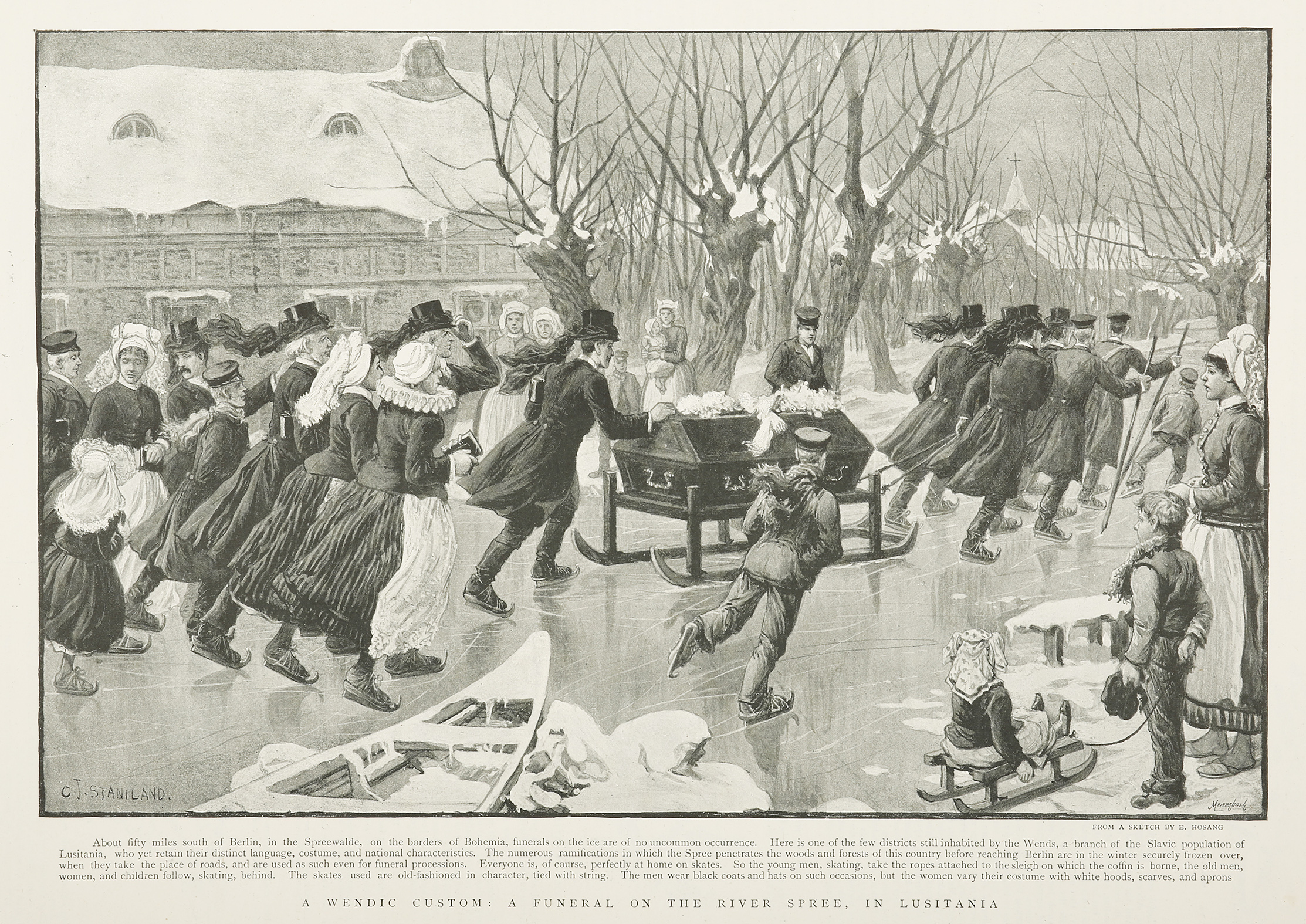 About fifty miles south of Berlin, in the Spreewalde, on the borders of Bohemia, funerals on the ice are of no uncommon occurrence. Here is one of the few districts still inhabited by the Wends, a branch of the Slavic population of Lusitania, who yet retain their distinct language, costume, and national characteristics. The numerous ramifications in which the Spree penetrates the woods and forests of this country before reaching Berlin are in the winter securely frozen over, when they take the place of roads, and are used as such even for funeral processions. Everyone is, of course, perfectly at home on skates. So the young men, skating, take the ropes attached to the sleigh on which the coffin is borne, the old men, women, and children follow, skating, behind. The skates used are old-fashioned in character, tied with string. The men wear black coats and hats and such occasions, but the women vary their costume with white hoods, scarves, and aprons.
