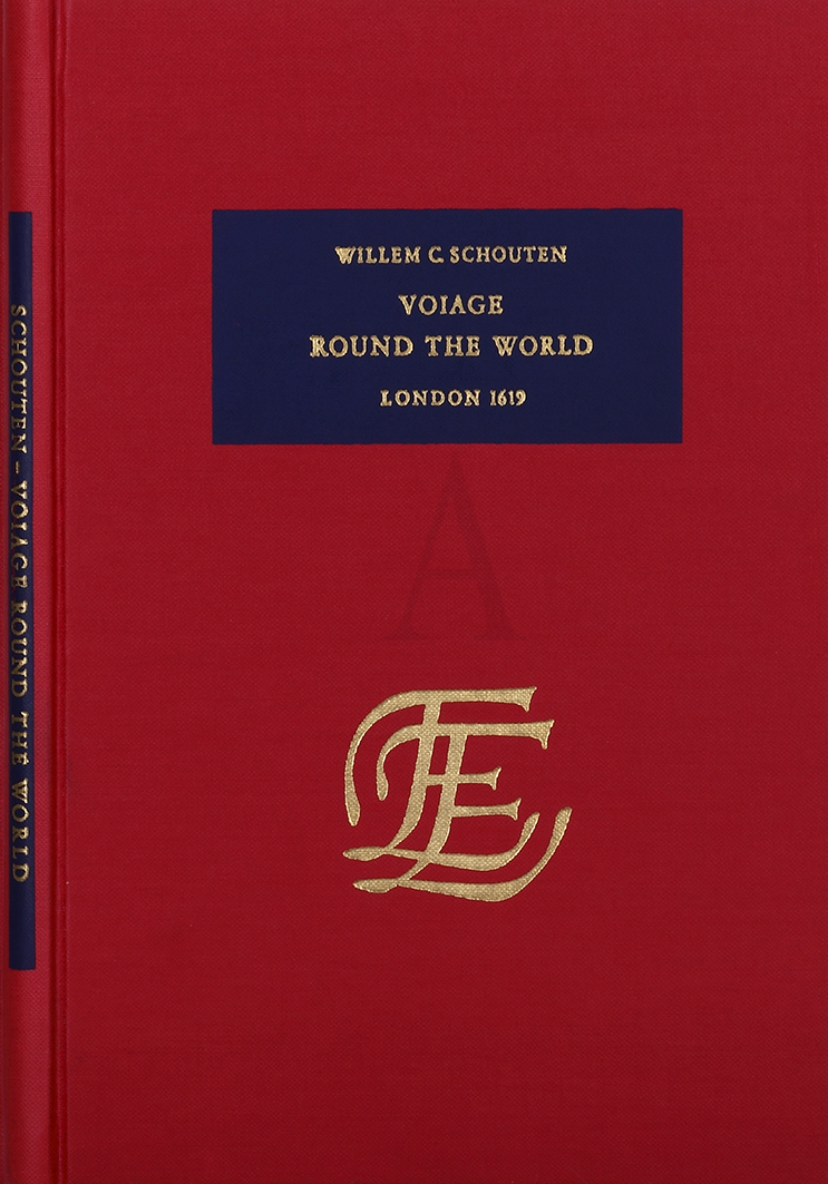 Facsimile edition by Da Capo Press and Theatrum Orbis Terrarum in 1968. Hardcover red cloth , with dark blue title panels and gilt lettering, 42 pages, 8 preliminary pages, 1 text map. Number 4 of "The English Experience its record in early printed books published in facsimile." Schoutens accounts describe his passage via Terra del Fuego to the East Indies. In 1615 Willem Cornelisz Schouten sailed from Texel in the Netherlands, in command of an expedition sponsored by Isaac Le Maire and his Australische Compagnie in equal shares with Schouten. The purpose of the voyage was to search for Terra Australis and to seek a new route to avoid the trade restrictions of the Dutch East India Company (VOC) by finding a new route to the Pacific and the Spice Islands. In 1616 Schouten rounded Cape Horn and followed the north coasts of New Ireland and New Guinea and visited adjacent islands, including what became known as the Schouten Islands.