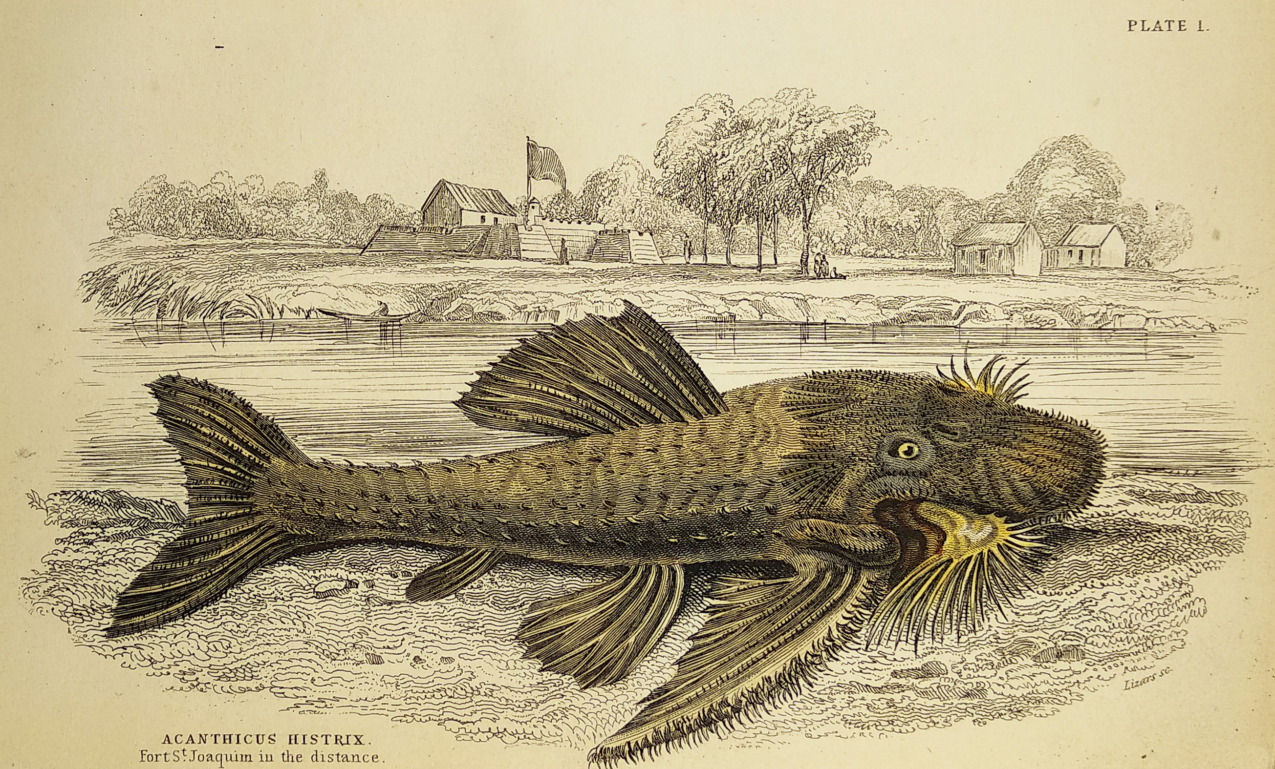 Acanthicus Histrix. Fort St. Joaquim in the distance. - Antique Print from 1843