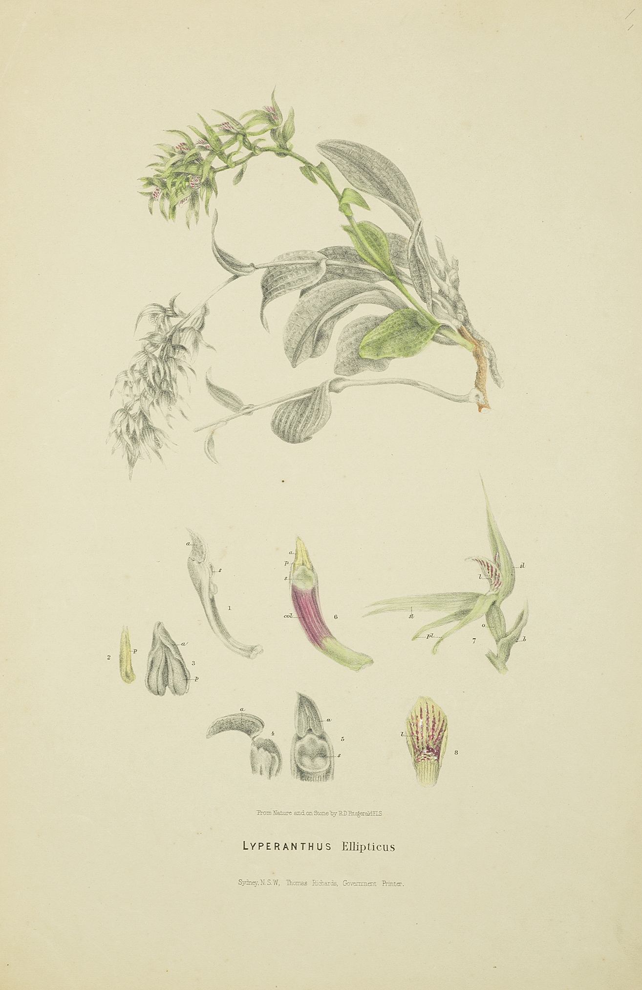 Robert Fitzgerald (1830-1902) Fitzgerald was a surveyor and naturalist, and arrived in Sydney from Ireland in 1856 and soon after was appointed to the Department of Lands as a draftsman for the crown. In his own time Fitzgerald pursued his interest in botany and in 1864 travelled to Wallis Lake, north of Newcastle in New South Wales to collect ferns and orchids which he intended to cultivate around his Hunter's Hill home. This interest in orchids was maintained throughout his life and in 1869, 1871 and 1876 he visited Lord Howe Island to collect further botanical samples. It was during this time that he discovered Dracophyllum fitzgeraldii F. Muell, which was later to be named in his honour. He worked for the Department of Lands and was an enthusiastic field collector, devoting himself especially to the native orchids. The publication of the 'Australian Orchids' was acclaimed throughout the botanical world. J.D. Hooker considered it 'a work which would bring honour to any country and to any botanist', while George Bentham wrote 'thanks to you the Australian Orchidaceae are now better known than those of any country out of Europe'.