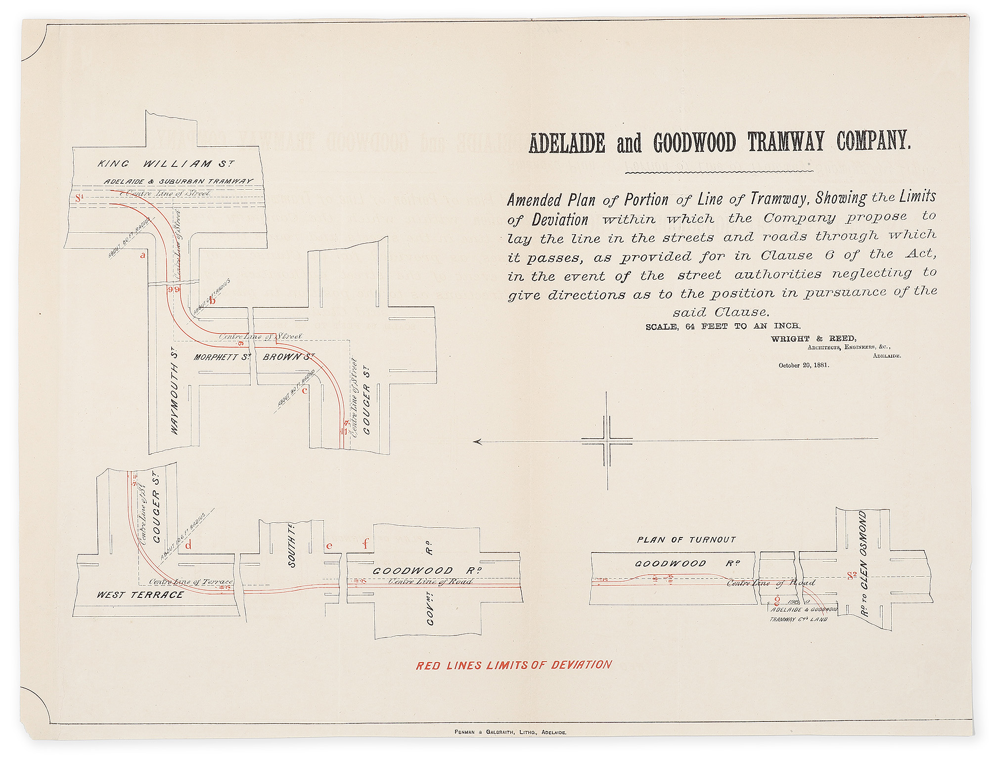 It was prepared by the architectural and engineering firm Wright & Reed to outline proposed deviations for a horse-drawn tram line. The plan illustrates the tramway’s path through several key Adelaide streets and landmarks. The city route originates at King William Street near the Adelaide and Suburban Tramway connection and travelled along Waymouth, Morphett, Brown, and Gouger Streets. The southern extension continues past West Terrace and South Terrace, heading south onto Goodwood Road toward a terminus at Clarence Park. Technical details on the map use red lines to indicate the Limits of Deviation, which defined the area where the company could legally lay tracks if the street authorities failed to provide specific positioning.