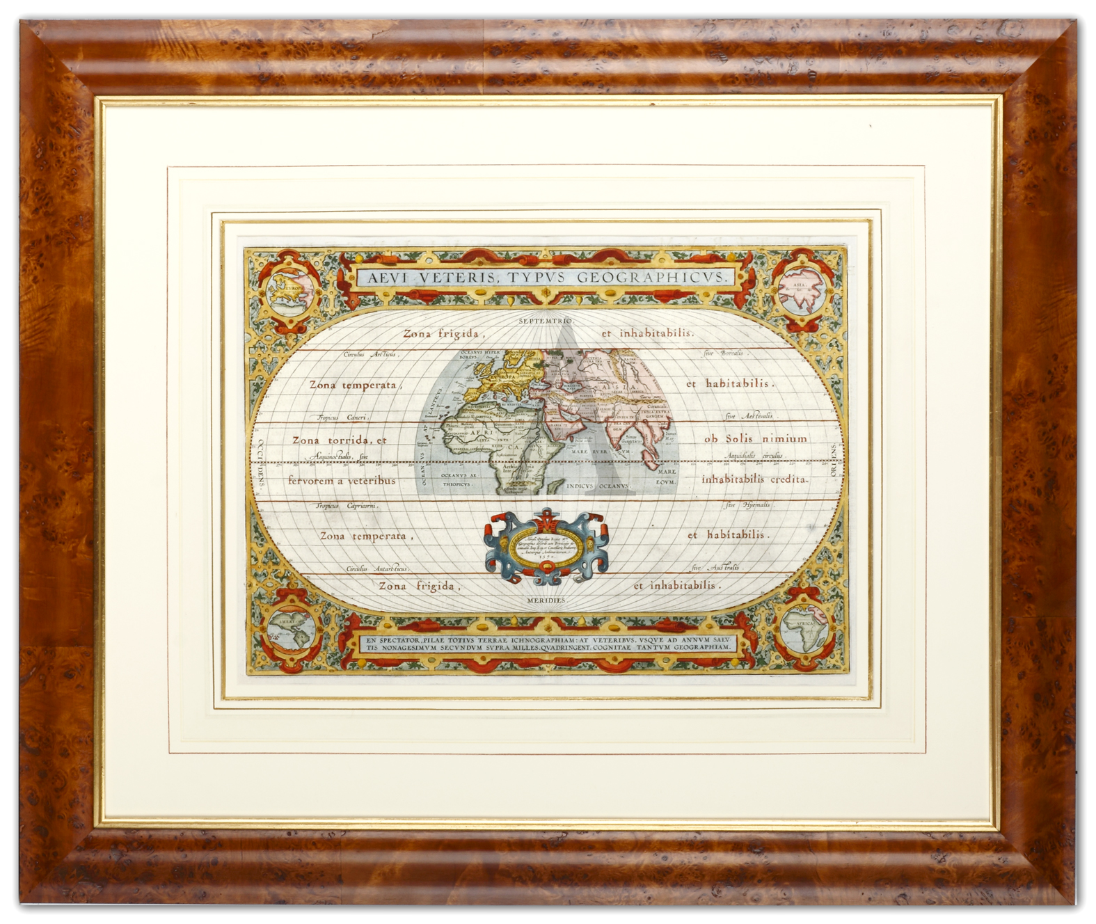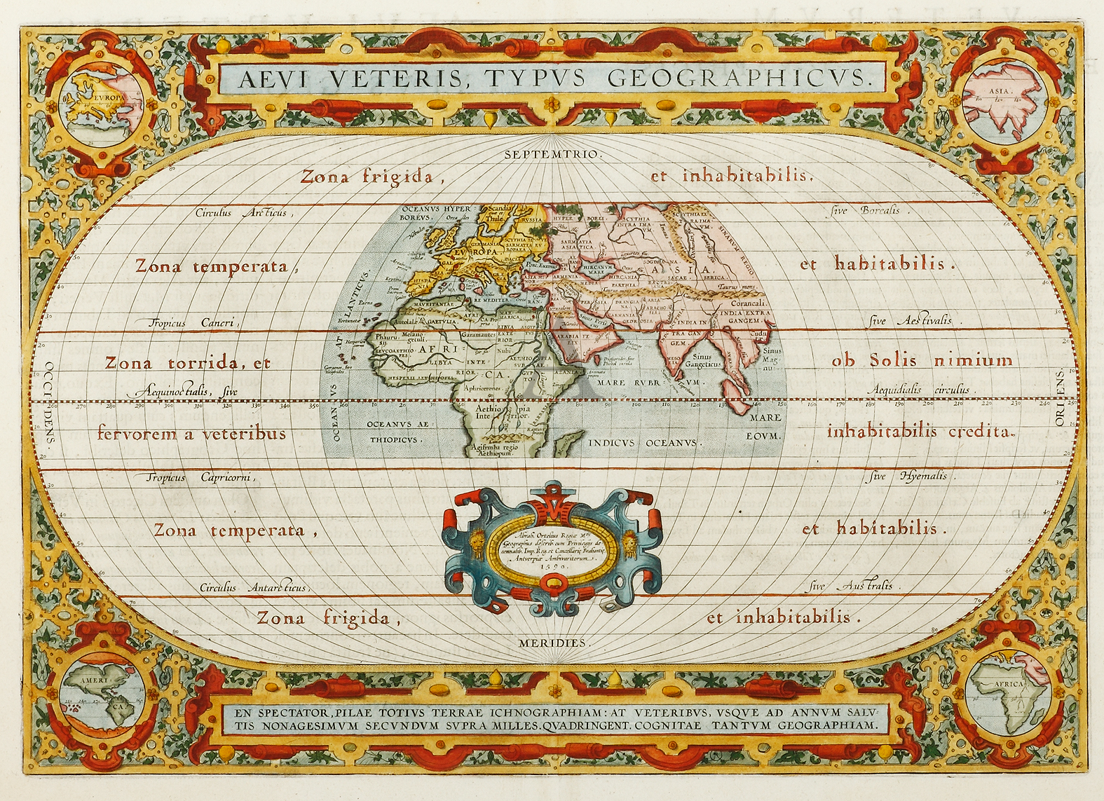 From Ortelius’s Theatrum Orbis Terrarum and regarded as the first modern atlas in having all the maps of a similar size and format. Extensively decorated with a fret work design and corner medallions of the four continents in miniature. This … Read Full Description
