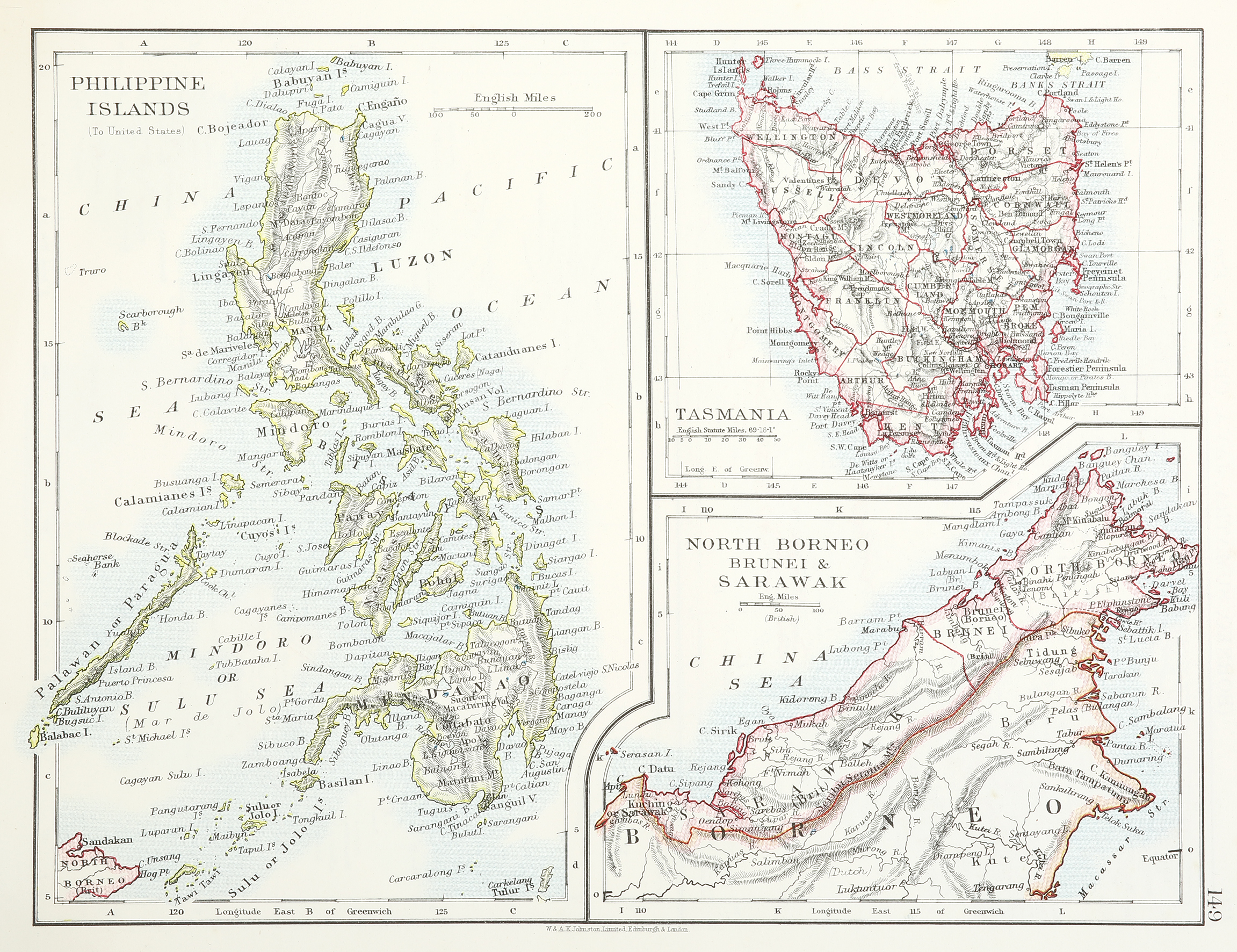 Detailed map of the Philippine islands, Tasmania and North Borneo Brunei & Sarawak.