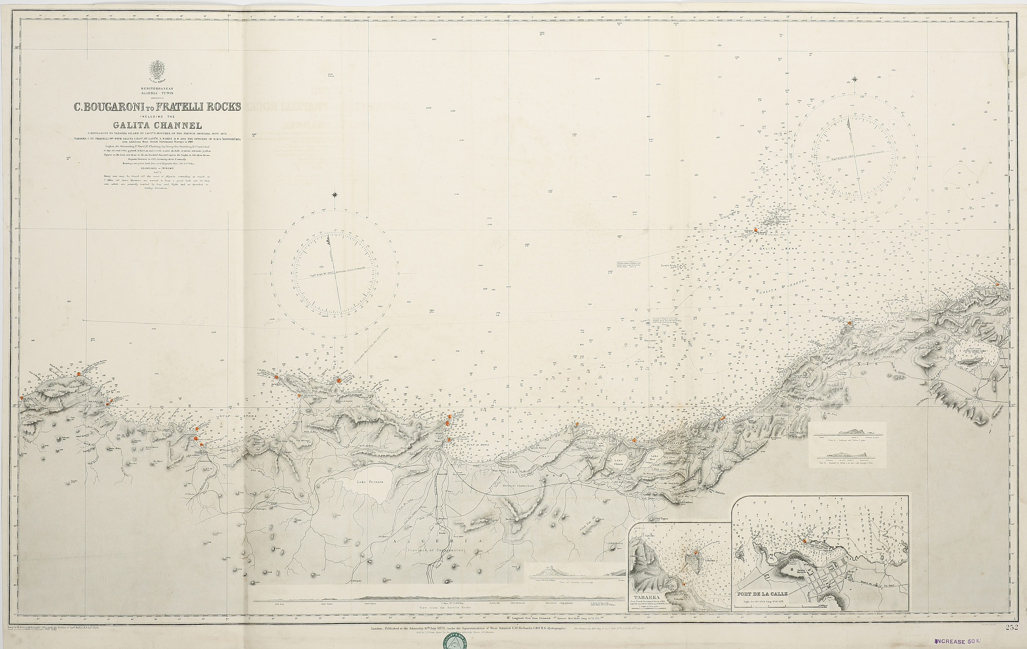 Detailed, large scale British Admiralty Hydrographic of Algeria, extending from Cape Bougaroni to Jebel Ishkel Lake. The chart was first issued 10th July, 1871, with latest new edition, July 1917 and with small corrections to 1922. There are two insets … Read Full Description