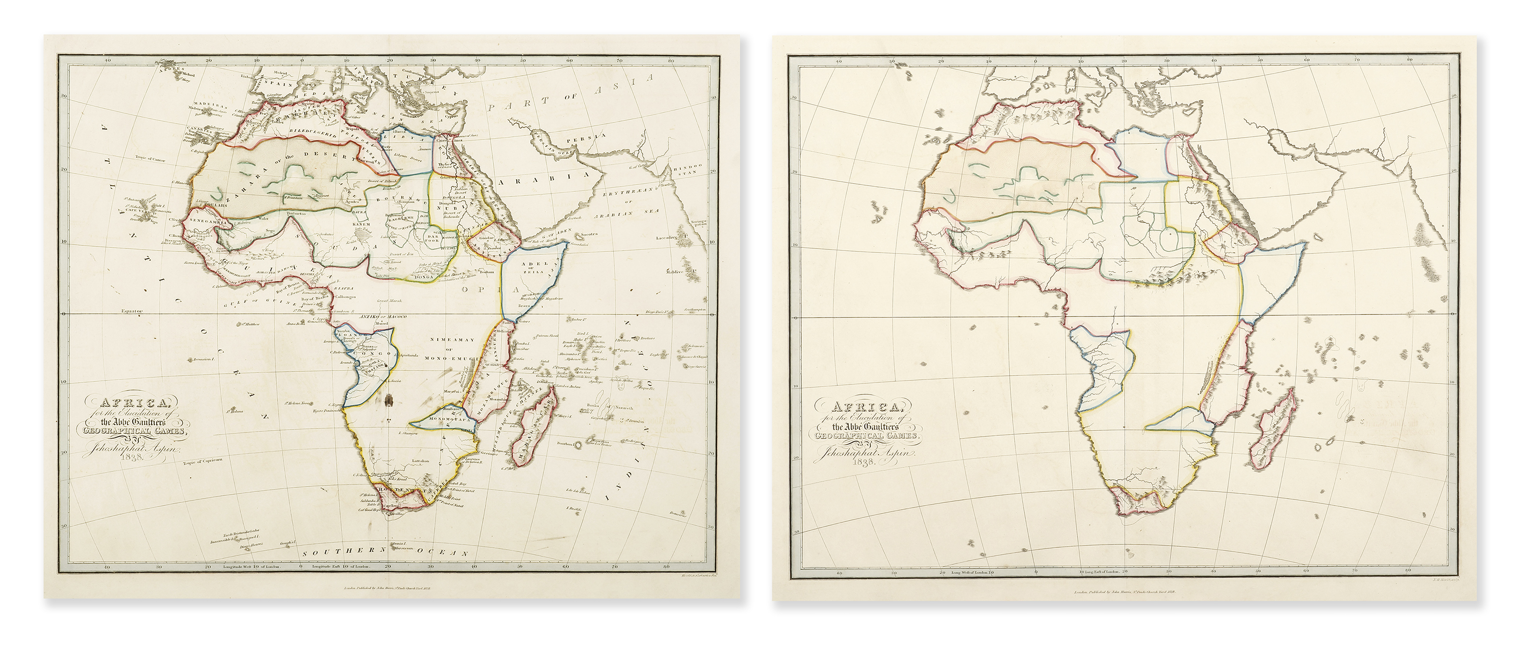 Scarce pair of educational maps of Africa, from, A complete course of geography, by means of instructive games, invented by the Abbe Gaultier, by Jehoshaphat Aspin. A Complete Course of Geography, by Means of Instructive Games invented by the Abbé Gaultier included ‘numerous emendations and additions, and an entire new set of maps, including the recent discoveries in the Arctic Regions’. Abbé Gaultier, an educationalist originally from Piedmont, had settled in France in 1780 and later fled the revolution to London. He died in 1818 but his Geography continued to be updated. In 1815 it was ‘collated with the author’s last Paris edition by Jehoshaphat Aspin’, a cartographer. It also presents coloured maps with all details given and another set of maps with only the outlines. Juliana Bayfield, ‘Games of Virtue and Learning’, The La Trobe Journal, 1997