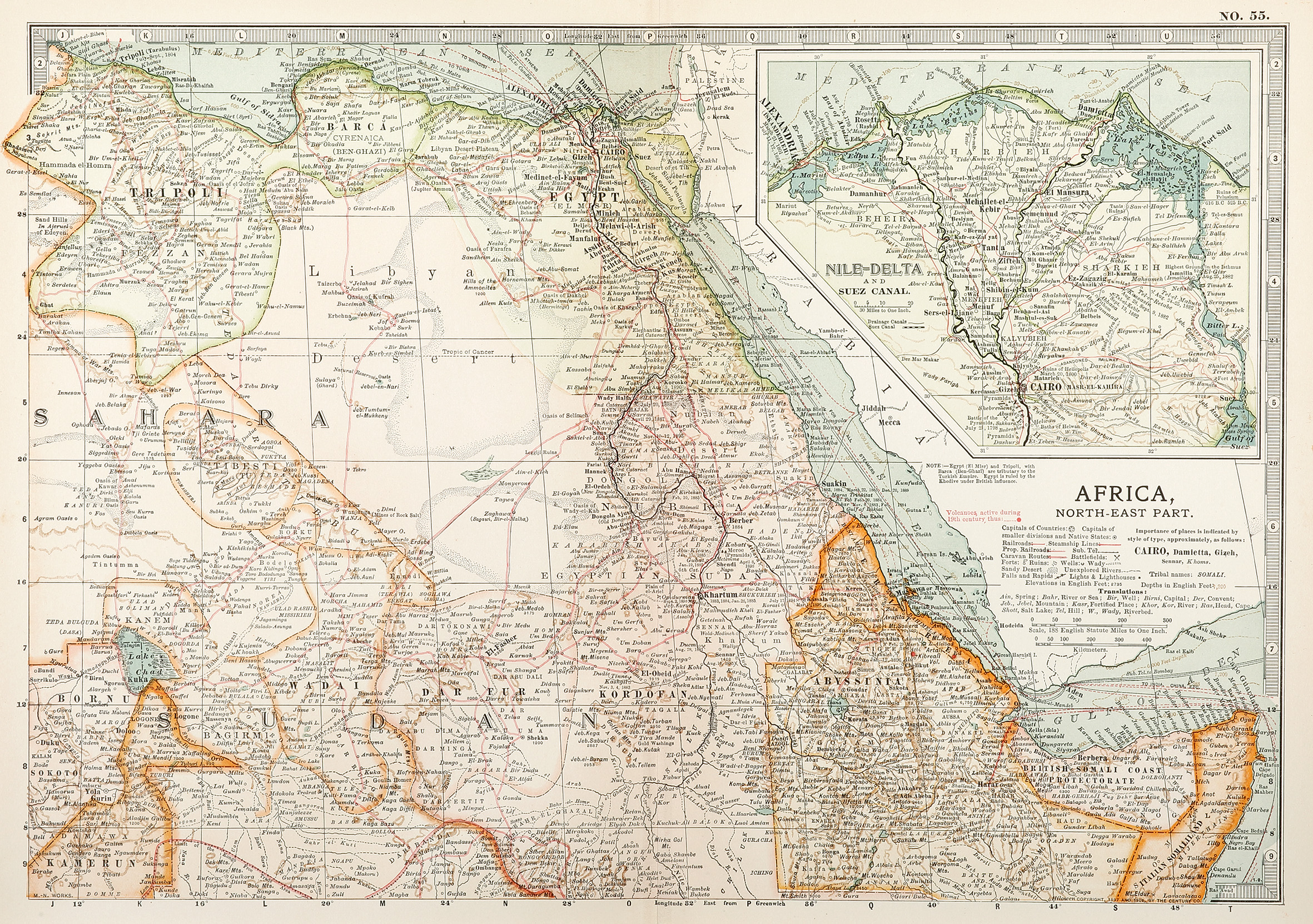 Detailed early c.20th map of north west Africa with an inset at top right of the Nile Delta.
