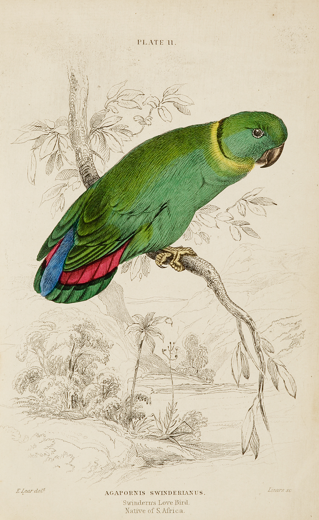 C19th engraving of the Black-collared lovebird . From the Naturalist Library.  Common name  Black-collared lovebird    Binomial name  Agapornis swindernianu   First described  Kuhl 1820