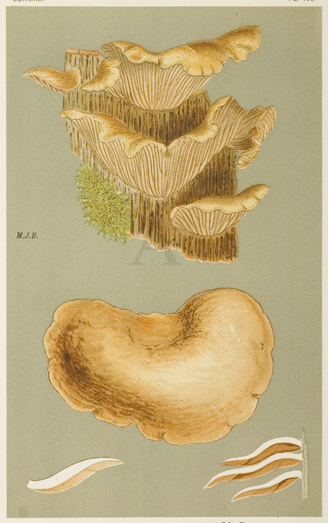 Lithograph of mushrooms from Illustrations of British Fungi by Mordecai Cubitt Cooke (1825 – 1914) who was an eminent mycologist, and the founder of the journal ‘Grevillea and one of the great promoters of mycology in England. ‘Cookes’s most ambitious … Read Full Description