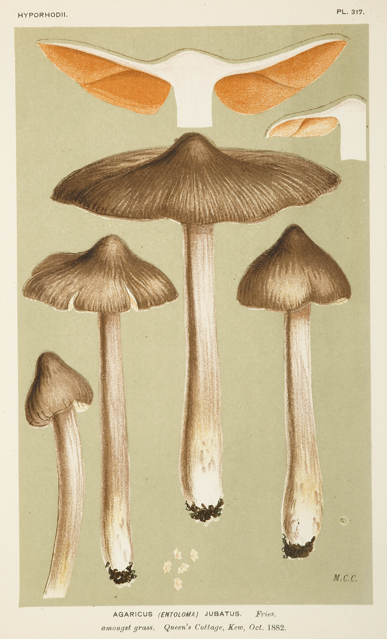 Lithograph of mushrooms from Illustrations of British Fungi by Mordecai Cubitt Cooke (1825 – 1914) who was an eminent mycologist, and the founder of the journal ‘Grevillea and one of the great promoters of mycology in England. ‘Cookes’s most ambitious work, the “Illustrations of British Fungi, is a monumental work of labor and patient application. I am told that not only did he make the original drawings of the plants, but that the figures were actually transferred by Cooke to the stones from which they were printed’ (C.G. Lloyd, Letter no. 57). ‘The number published of the Illustrations of British Fungi must have been very small as there were only 70 subscribers in Britain when volume 2 was issued.’ Stafleu & Cowan