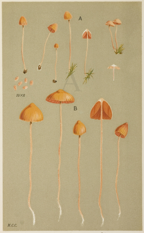 Found amongst moss and sphagnum. Lithograph of mushrooms from Illustrations of British Fungi by Mordecai Cubitt Cooke (1825 – 1914) who was an eminent mycologist, and the founder of the journal ‘Grevillea and one of the great promoters of mycology in England. ‘Cookes’s … Read Full Description