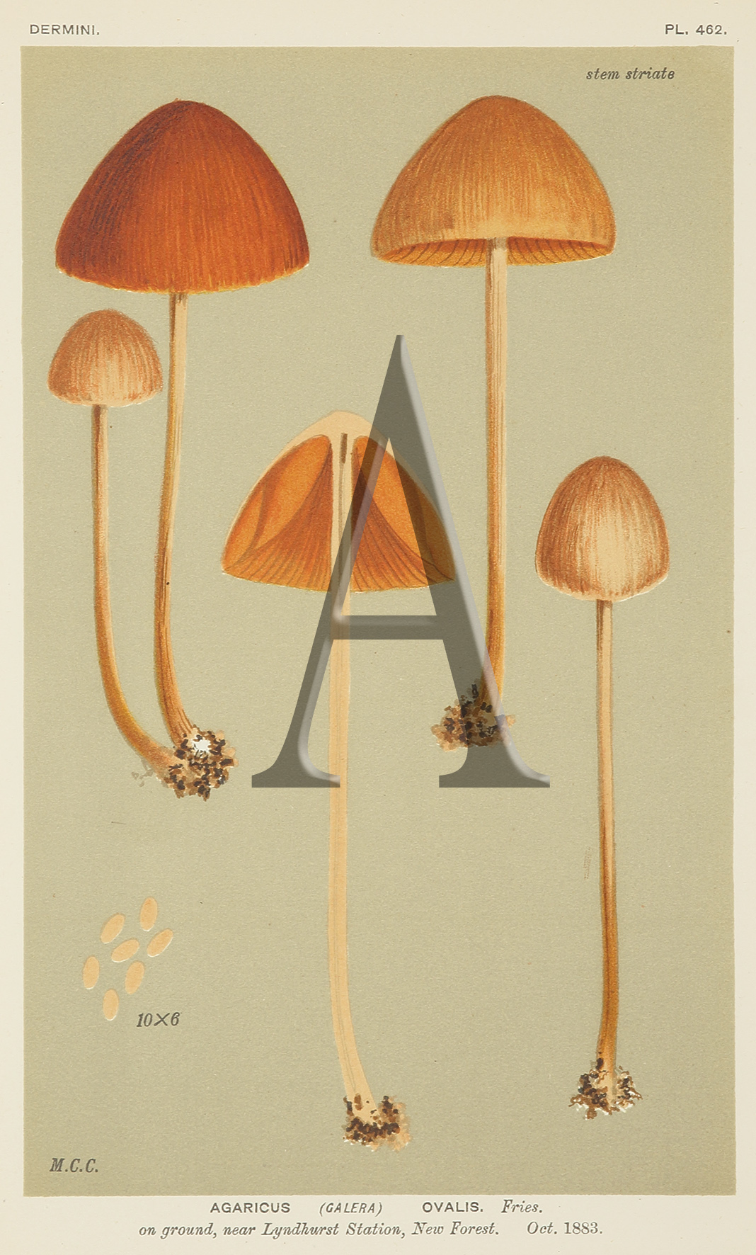 Lithograph of mushrooms from Illustrations of British Fungi by Mordecai Cubitt Cooke (1825 – 1914) who was an eminent mycologist, and the founder of the journal ‘Grevillea and one of the great promoters of mycology in England. ‘Cookes’s most ambitious work, the “Illustrations of British Fungi, is a monumental work of labor and patient application. I am told that not only did he make the original drawings of the plants, but that the figures were actually transferred by Cooke to the stones from which they were printed’ (C.G. Lloyd, Letter no. 57). ‘The number published of the Illustrations of British Fungi must have been very small as there were only 70 subscribers in Britain when volume 2 was issued.’ Stafleu & Cowan