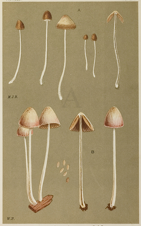 Found amongst chips. Lithograph of mushrooms from Illustrations of British Fungi by Mordecai Cubitt Cooke (1825 – 1914) who was an eminent mycologist, and the founder of the journal ‘Grevillea and one of the great promoters of mycology in England. ‘Cookes’s most ambitious … Read Full Description