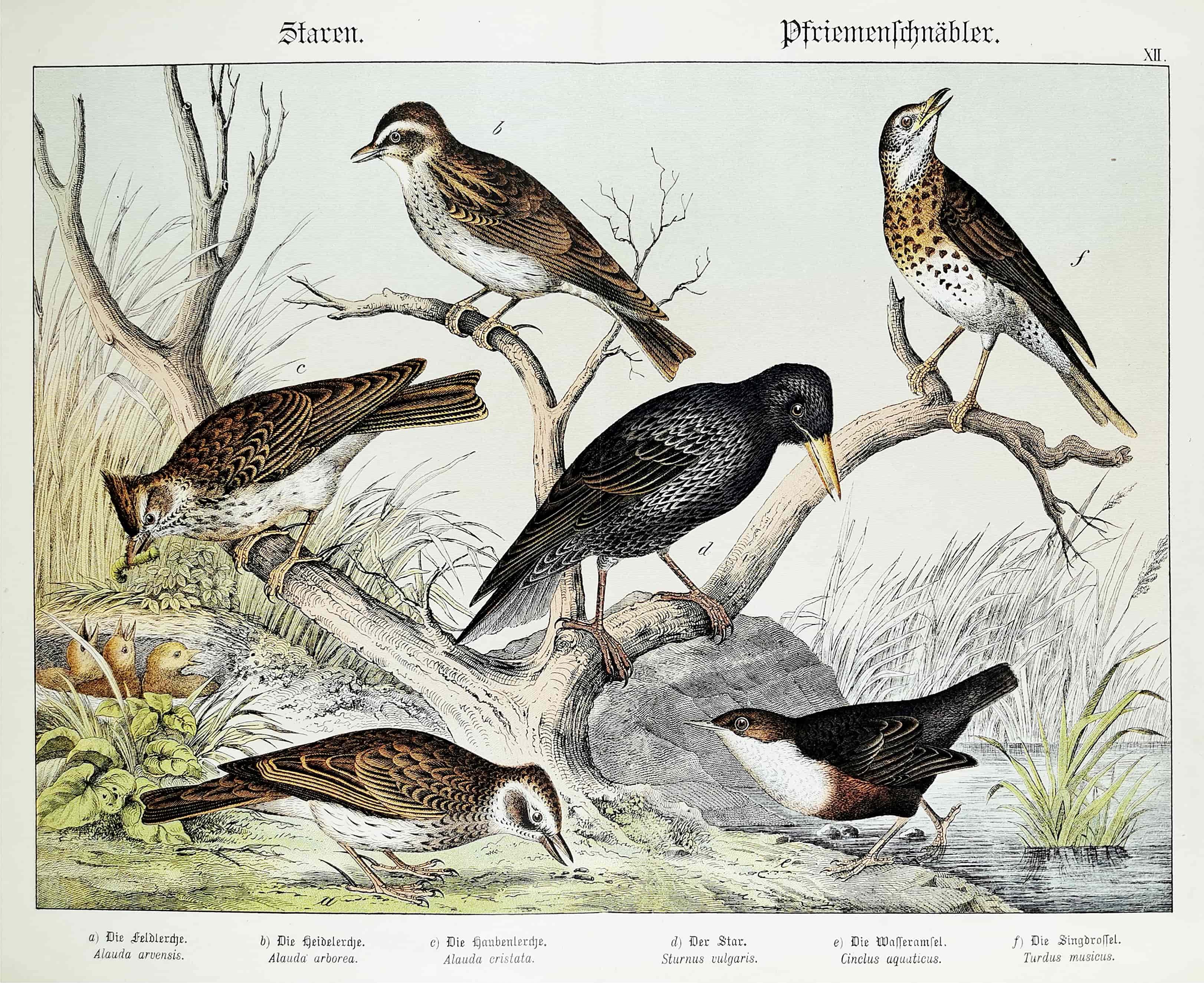 German c.19th lithograph of the Eurasian skylark, woodlark, Crested lark, Common starling, White-throated Dipper and Song thrush.